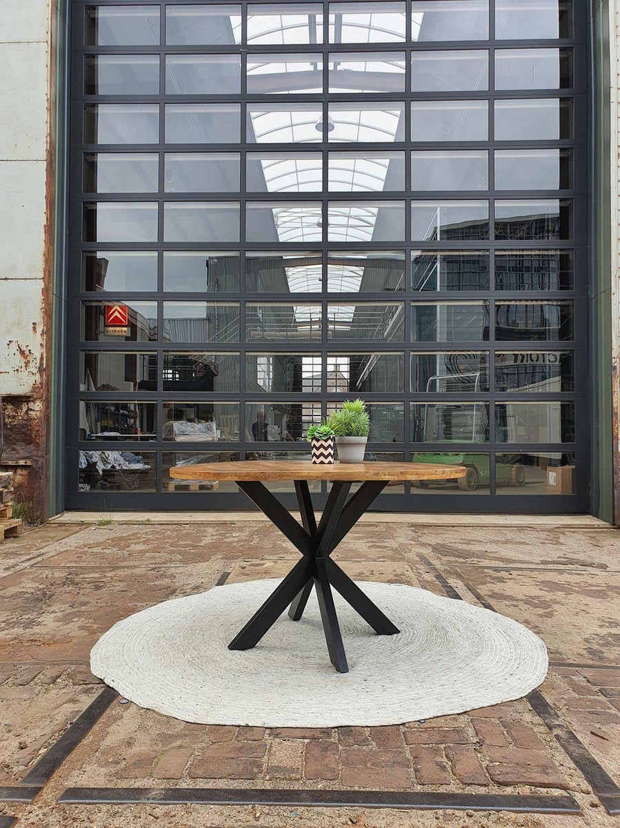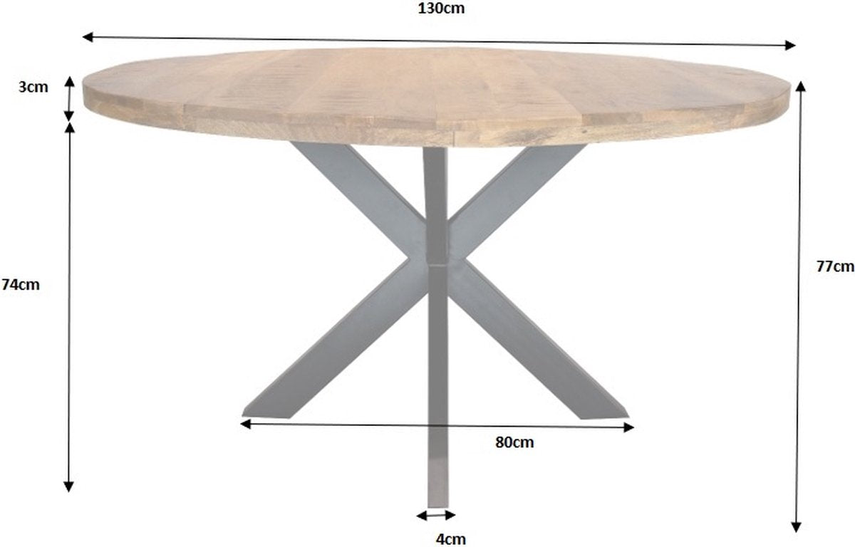 ✓ 130cm in diameter ✓ 77cm hoogte ✓ 74cm ruimte voor stoelen met armleuning ✓ Metalen zwarte 4 poot ✓ robuuste look ✓ blad van echt hout ✓ monteren zonder eigen gereedschap ✓ Duurzaam en verantwoord