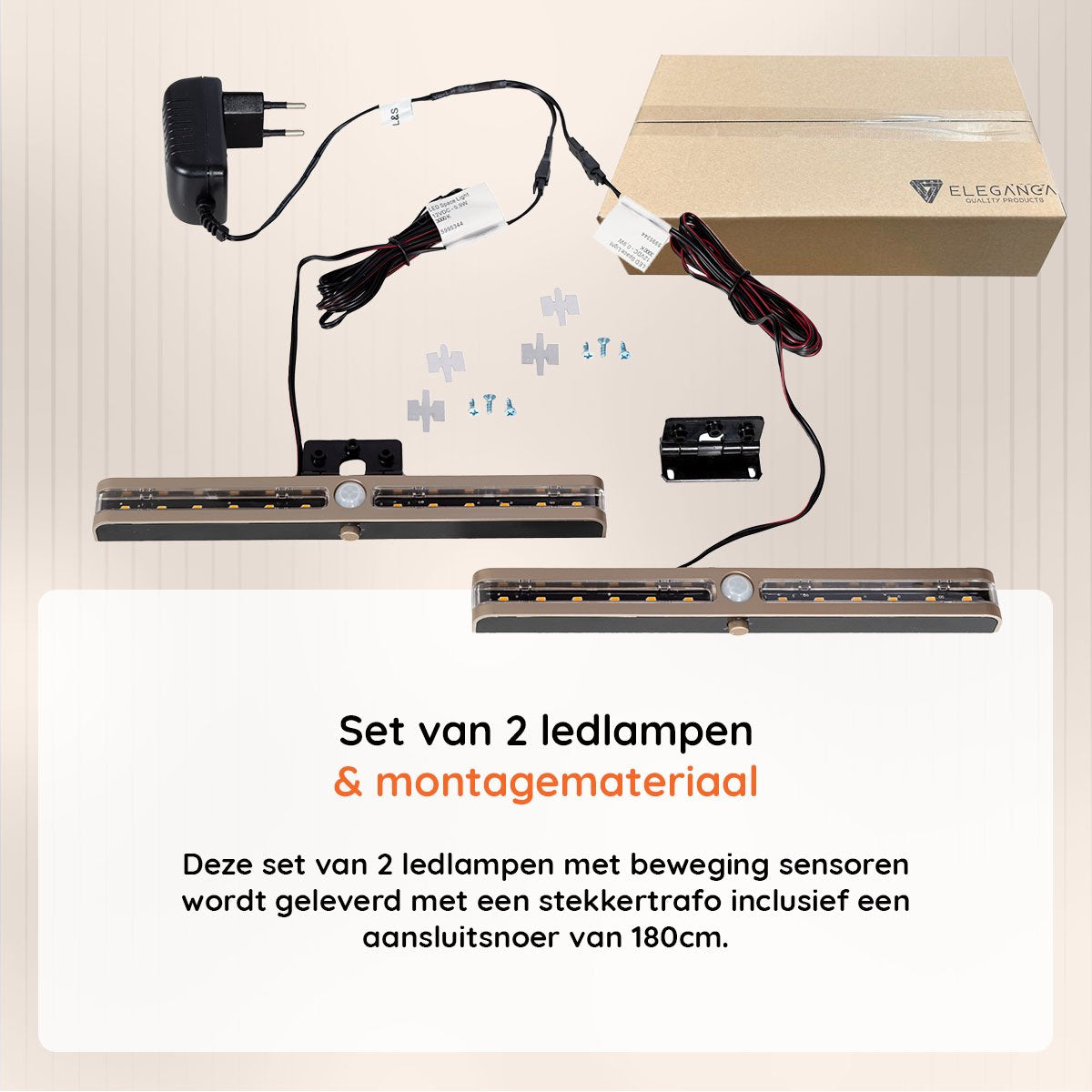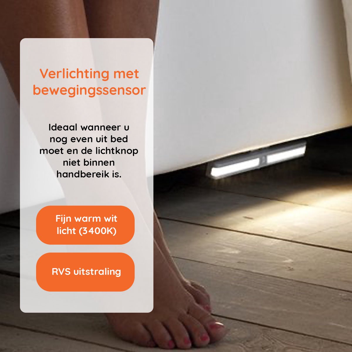 Deze set van 2 ledlampen met beweging sensoren, geschikt om eenvoudig te monteren onder bedden, is ideaal om s’nachts gemakkelijk de weg te vinden in het donker. De uitstapverlichting heeft een RVS uitstraling en is gemaakt van hoge kwaliteit kunststof. Het fijne, warme witte licht is gemakkelijk in te stellen tussen de 20 seconden en 4 minuten brandduur. Ideaal wanneer u nog even uit bed moet en de lichtknop niet binnen handbereik is. De bedlamp wordt geleverd met een stekkertrafo inclusief een aansluitsnoer van 180cm.
