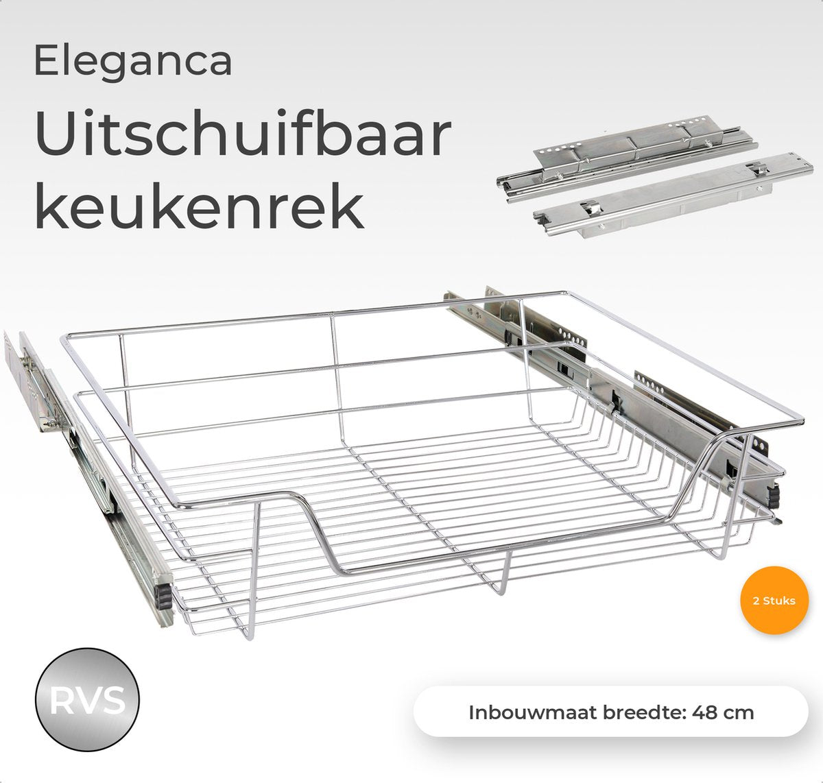 Eleganca draadmand met zijgeleider - 2 Stuks - Keukenkast schuiflade – B41.5 cm, H14 cm & D44.5 cm – Uitschuifbaar keukenrek - Geschikt voor kastjes met een frontbreedte van 50 cm – Inbouwlade – Maximale belastbaarheid 20 kg – RVS – Zilver