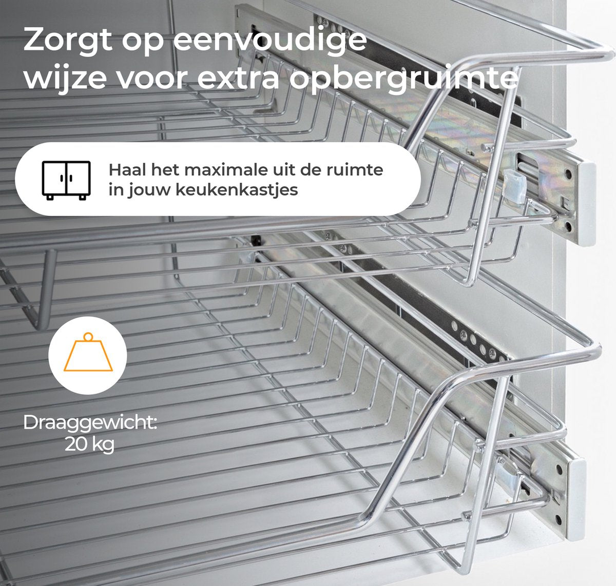 Met de stevige schuiflade van Eleganca haal je het uiterste uit jouw opbergruimte. In hoge kasten is het lastig om effectief je spullen op te bergen en inbouwlades zijn hier de ideale oplossing voor. Door de Eleganca draadmand te instaleren optimaliseer je de opbergruimte. De lades zijn zeer sterk en kunnen maar liefst 20 kg dragen. Dankzij de Soft Close functie hoef je je geen zorgen te maken om harde geluiden wanneer je de lade dicht duwt.