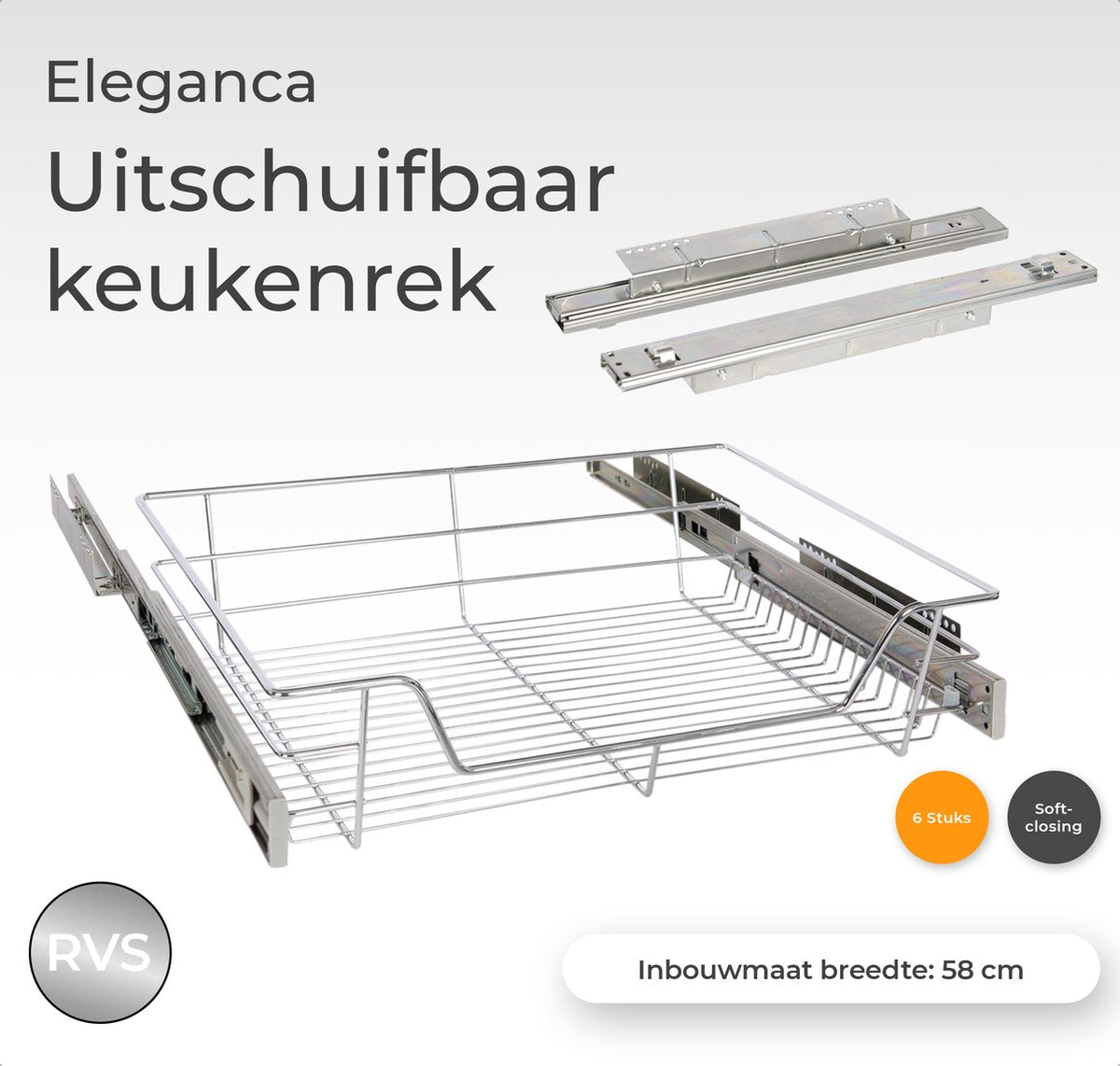 Eleganca draadmand met zijgeleider en Soft Closing - Keukenkast schuiflade – B51.5 x H14x D44.5 cm – Uitschuifbaar keukenrek – Inbouwlade – Maximale belastbaarheid 20kg – RVS – Zilver - 6 Stuks