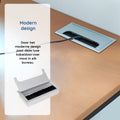 Je sluit de doorvoer makkelijk af met de scharnierende klep. Door het elegante ontwerp kun je zo op een nette en stijlvolle manier het gat in je bureau afdichten.