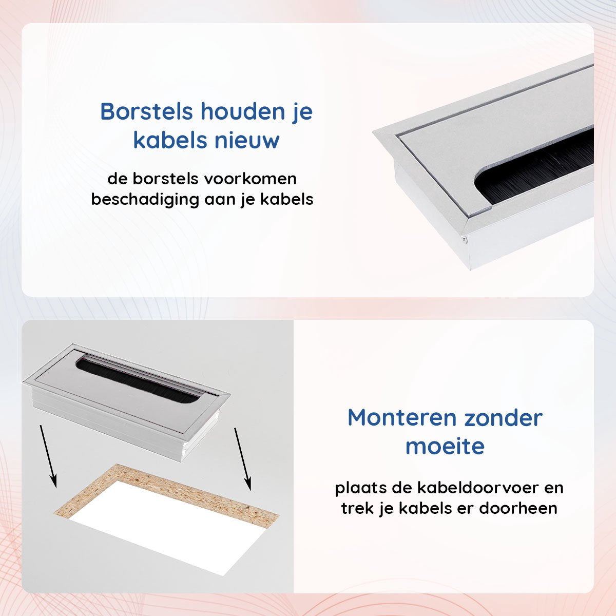 De borstels voorkomen beschadiging aan je kabels door stof, vuil en slijtage aan randen. Zo is de kabeldoorvoer ook ideaal voor zit-sta bureaus, en gaat je bedrading niet kapot door je bureau te verstellen in hoogte.