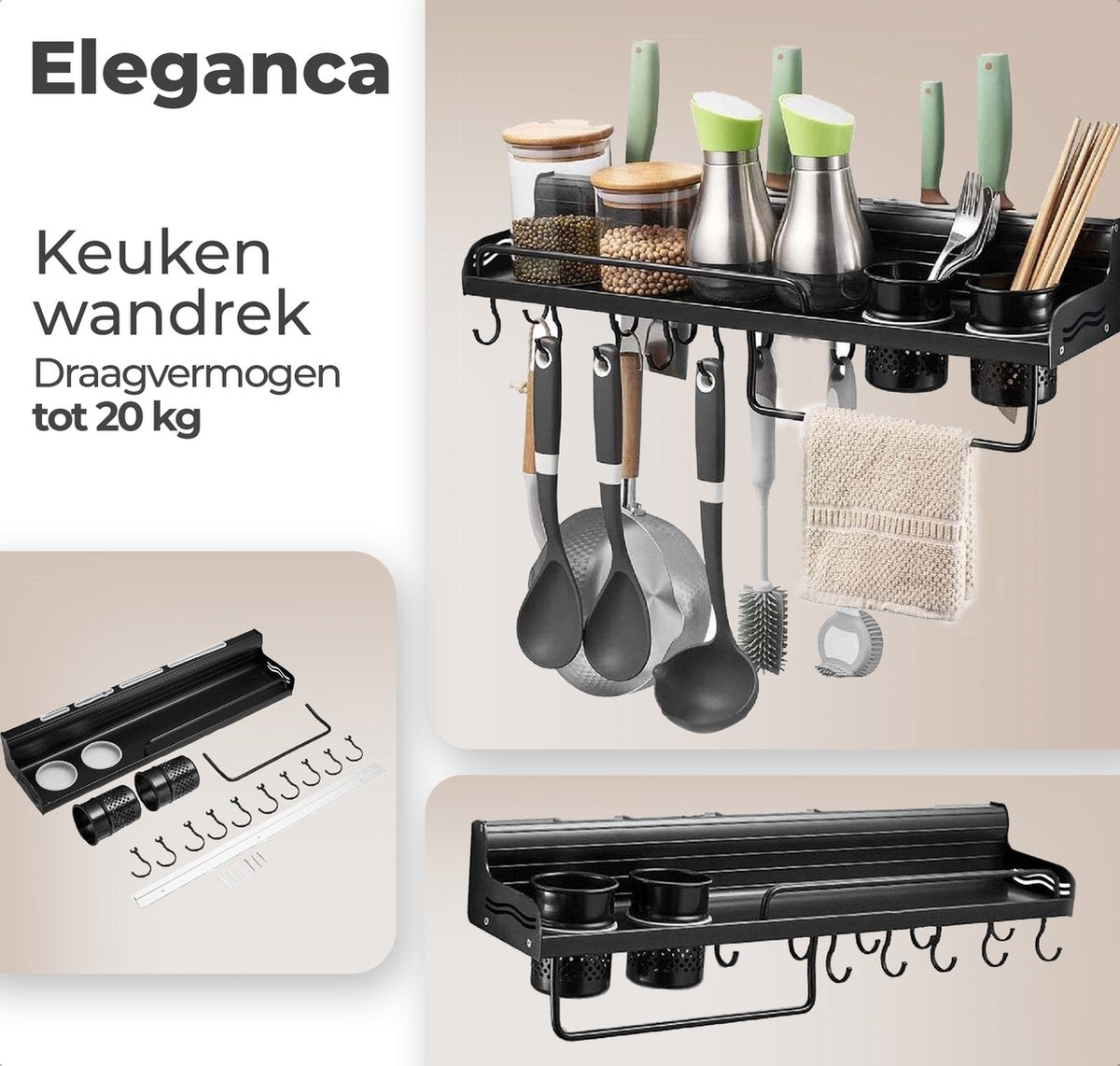 Ervaren kookliefhebbers en beginnende koks weten dat elke ruimte en opbergmogelijkheid in de keuken van grote waarde is. Het Eleganca wandrek biedt de mogelijkheid om veel verschillend keukengerei netjes op te hangen en weg te werken. De zeer stevige materialen van het keukenrek maken het mogelijk om tot 20kg aan één van de 10 haken op te hangen.
