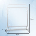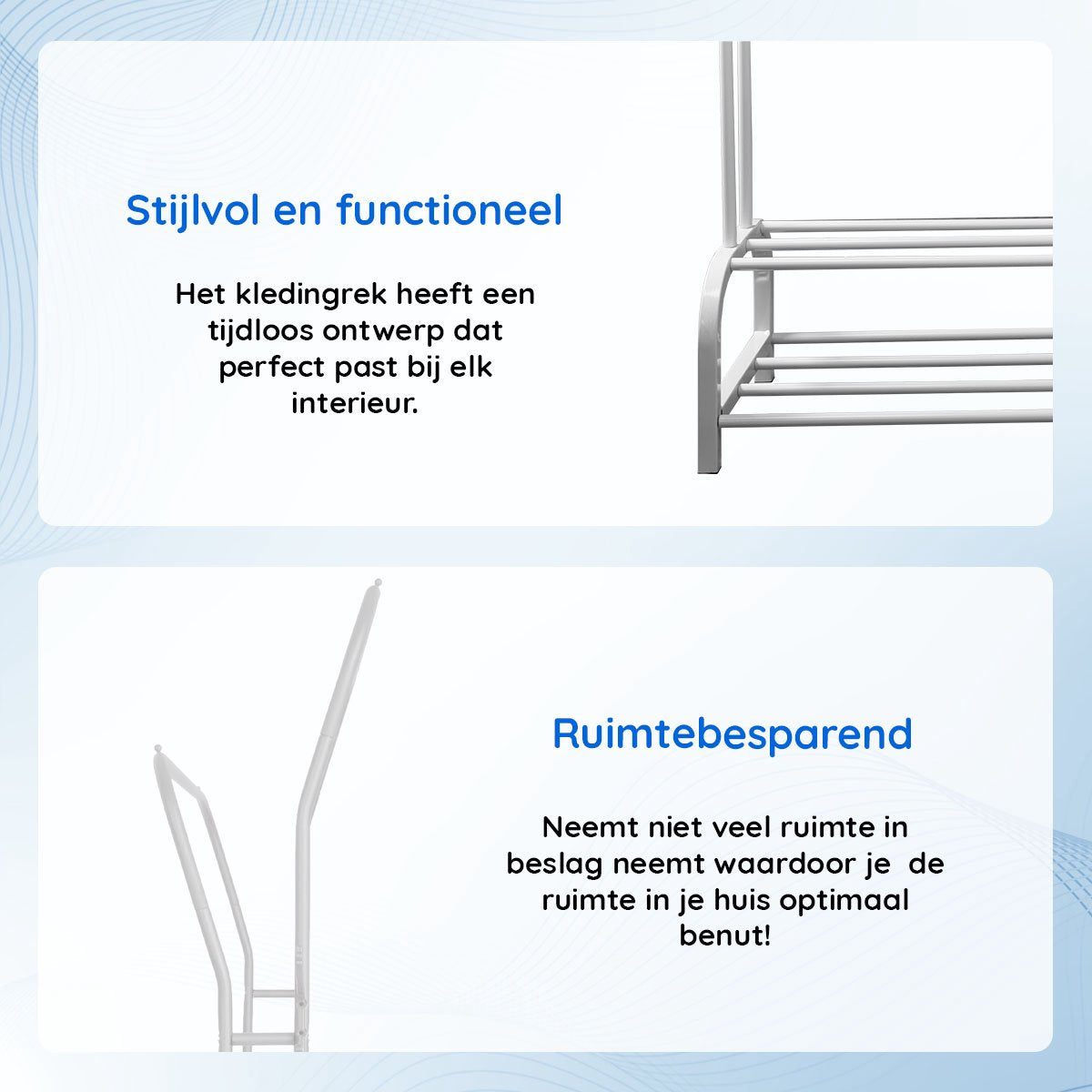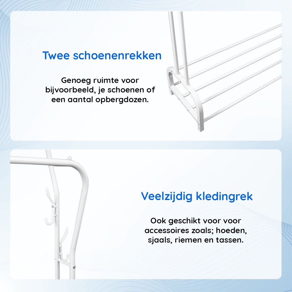 Naast het ophangen van kleding biedt het kledingrek extra opslagmogelijkheden, zoals planken voor schoenen of accessoires, waardoor het een veelzijdige oplossing is voor het organiseren van diverse kledingstukken en items.