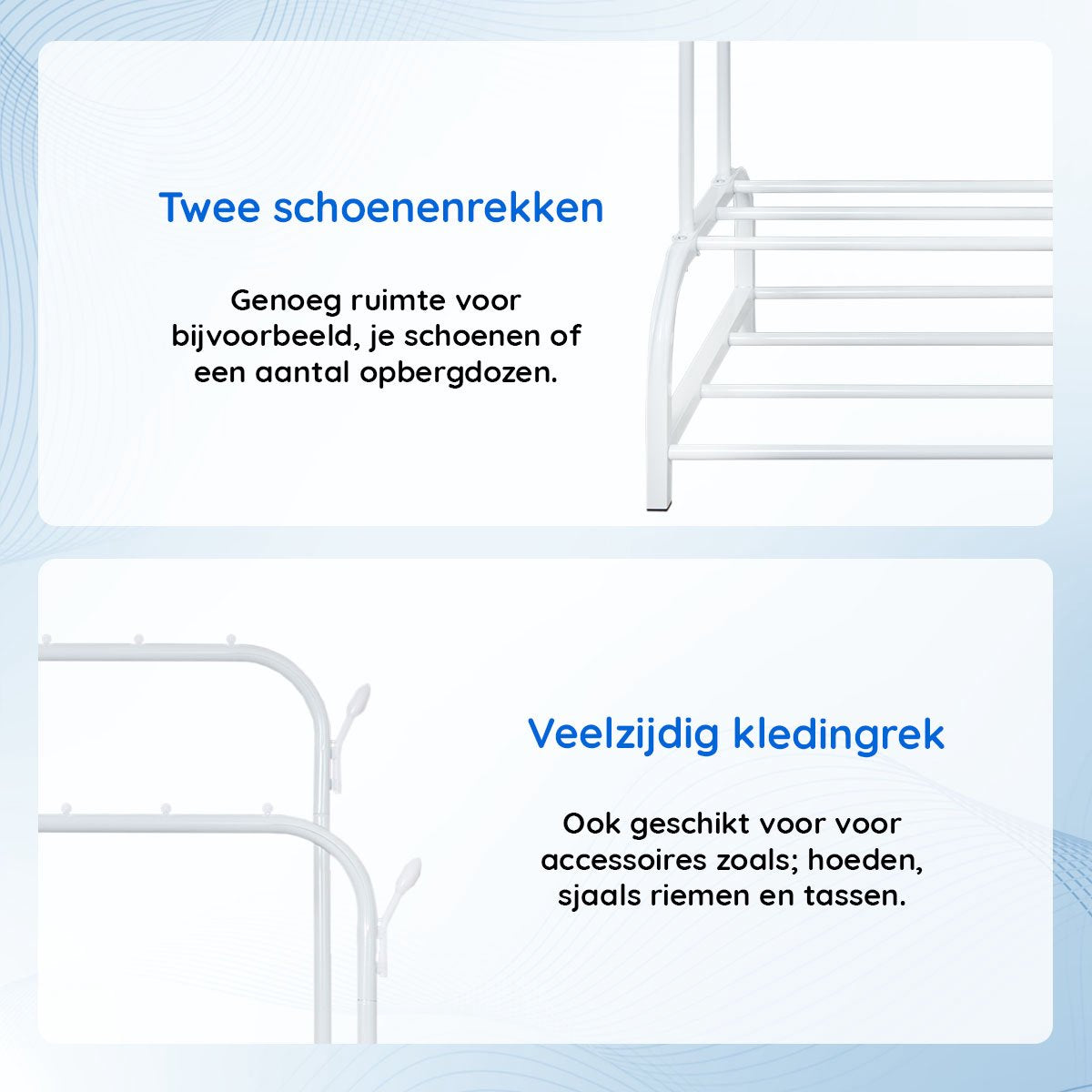Ontdek het veelzijdige Eleganca kledingrek: perfect voor het organiseren van kleding, schoenen én accessoires. Met twee kledingstangen, haken en handig schoenenrekken bespaart dit rek ruimte, past het in elk interieur en minimaliseert het kreukelen, waardoor je kleding altijd fris blijft. Met Eleganca combineer je functionaliteit en stijl voor een georganiseerde garderobe.