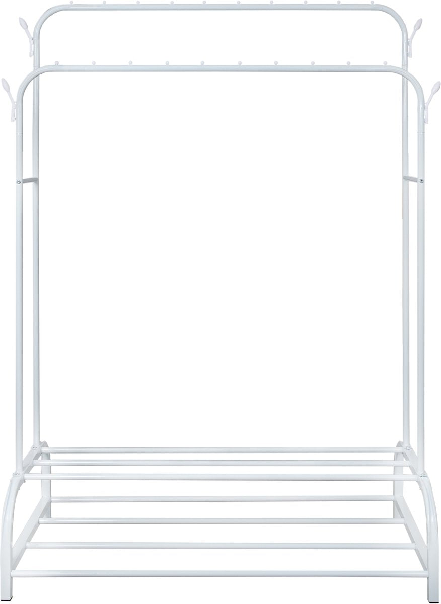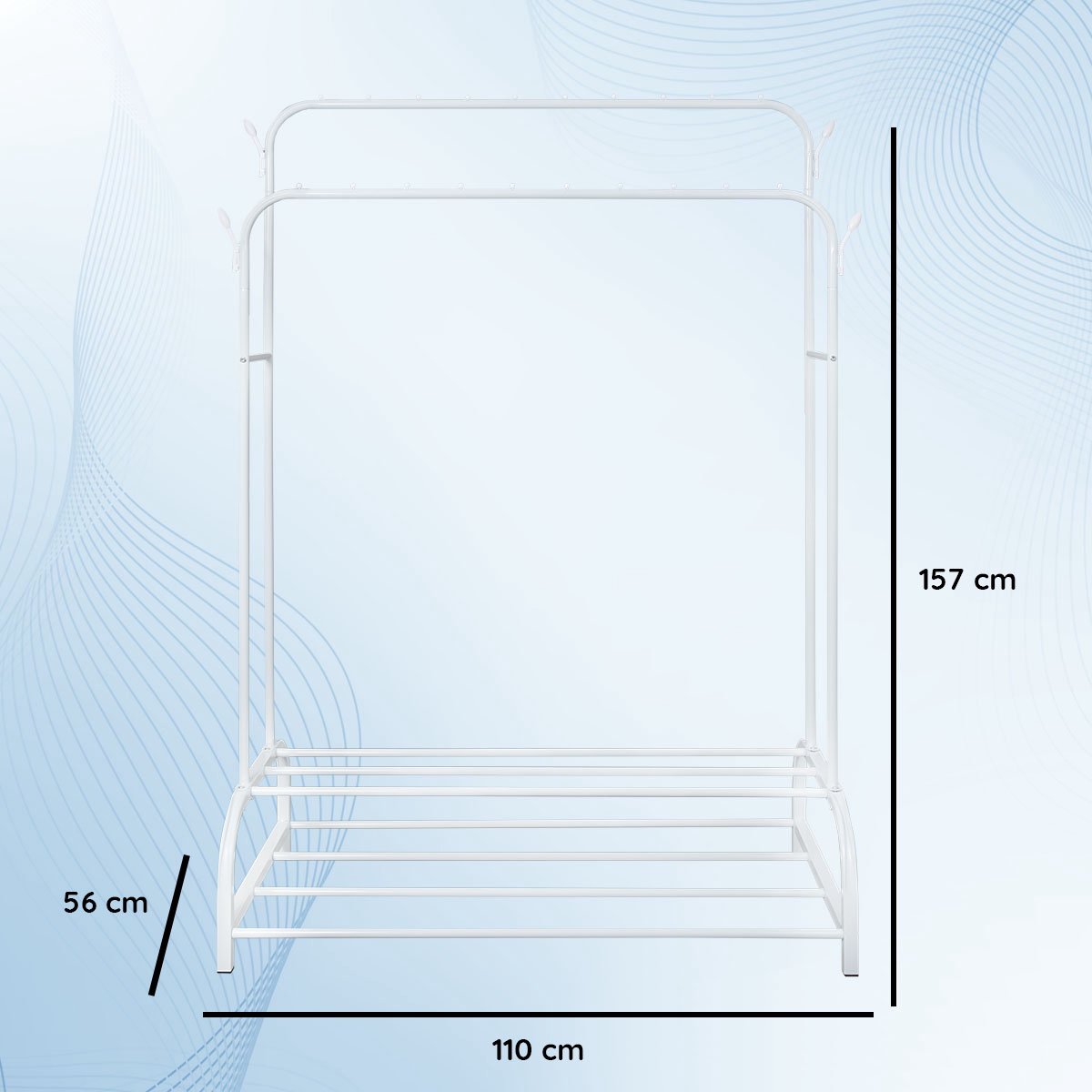 Eleganca Kledingrek – H157 x B110 x D56 cm – Garderoberek – Dressboy - Kledingrek metaal - Stijlvol en Functioneel - voor Kleding, Schoenen en Accessoires - 2 Kledingstangen - met 2 Planken en 4 Haken – Metaal - Wit
