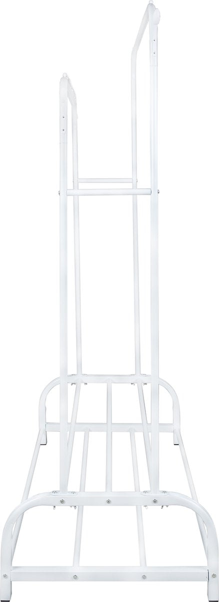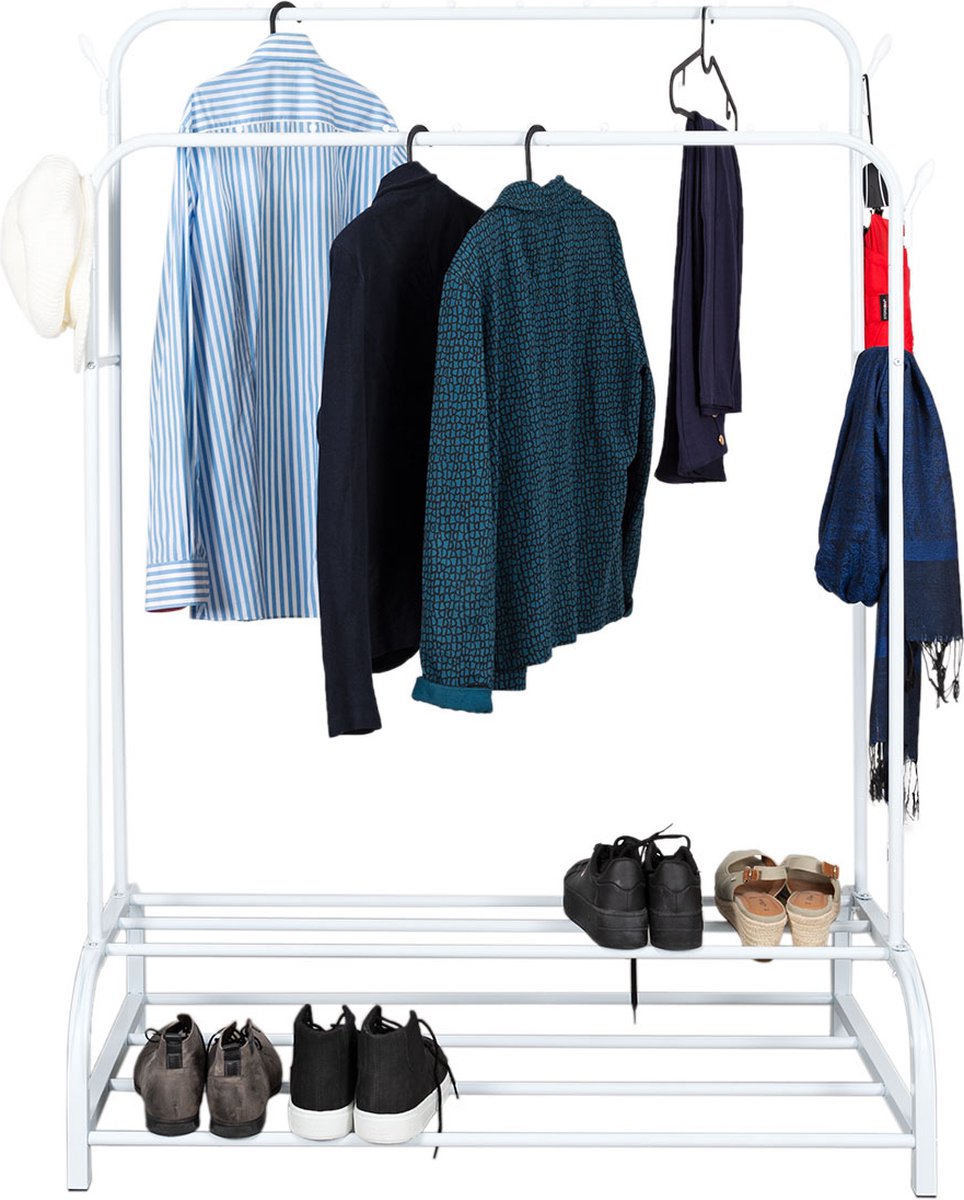 Ideaal aan dit kledingrek, is dat het niet alleen geschikt is voor kleding en schoenen, maar ook voor accessoires zoals; hoeden, sjaals riemen en tassen. Het is namelijk een veelzijdige kledingrek met 2 kledingstangen, 2 schoenenrekken. Dankzij de metalen plank biedt het garderoberek ook nog eens genoeg ruimte voor bijvoorbeeld, je schoenen of een aantal opbergdozen.