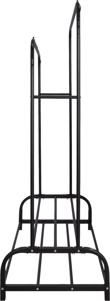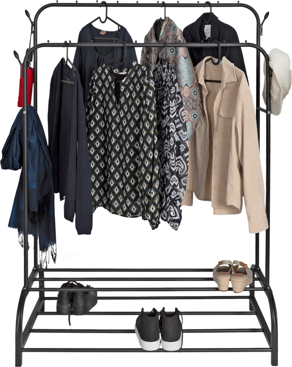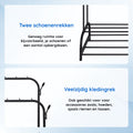Ideaal aan dit kledingrek, is dat het niet alleen geschikt is voor kleding en schoenen, maar ook voor accessoires zoals; hoeden, sjaals riemen en tassen. Het is namelijk een veelzijdige kledingrek met 2 kledingstangen, 2 schoenenrekken. Dankzij de metalen plank biedt het garderoberek ook nog eens genoeg ruimte voor bijvoorbeeld, je schoenen of een aantal opbergdozen.