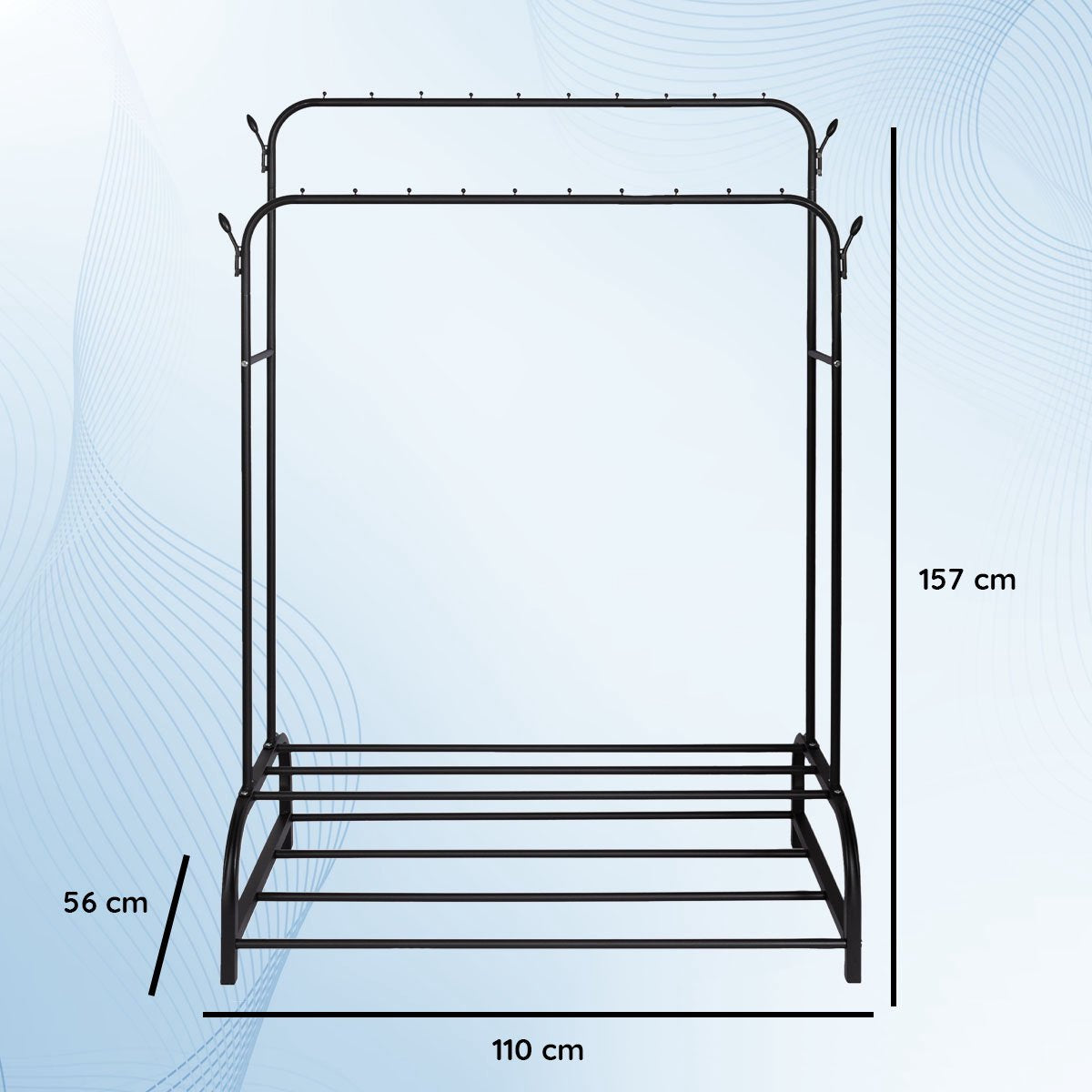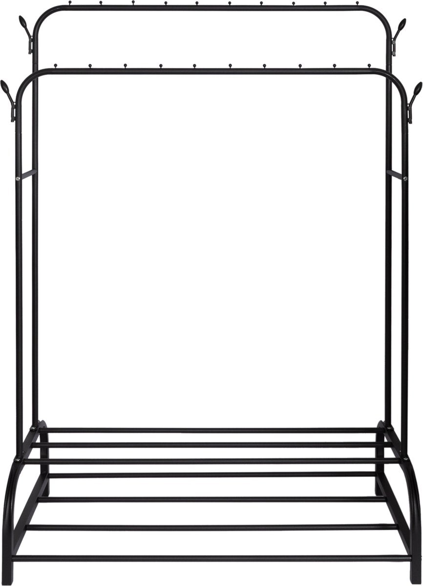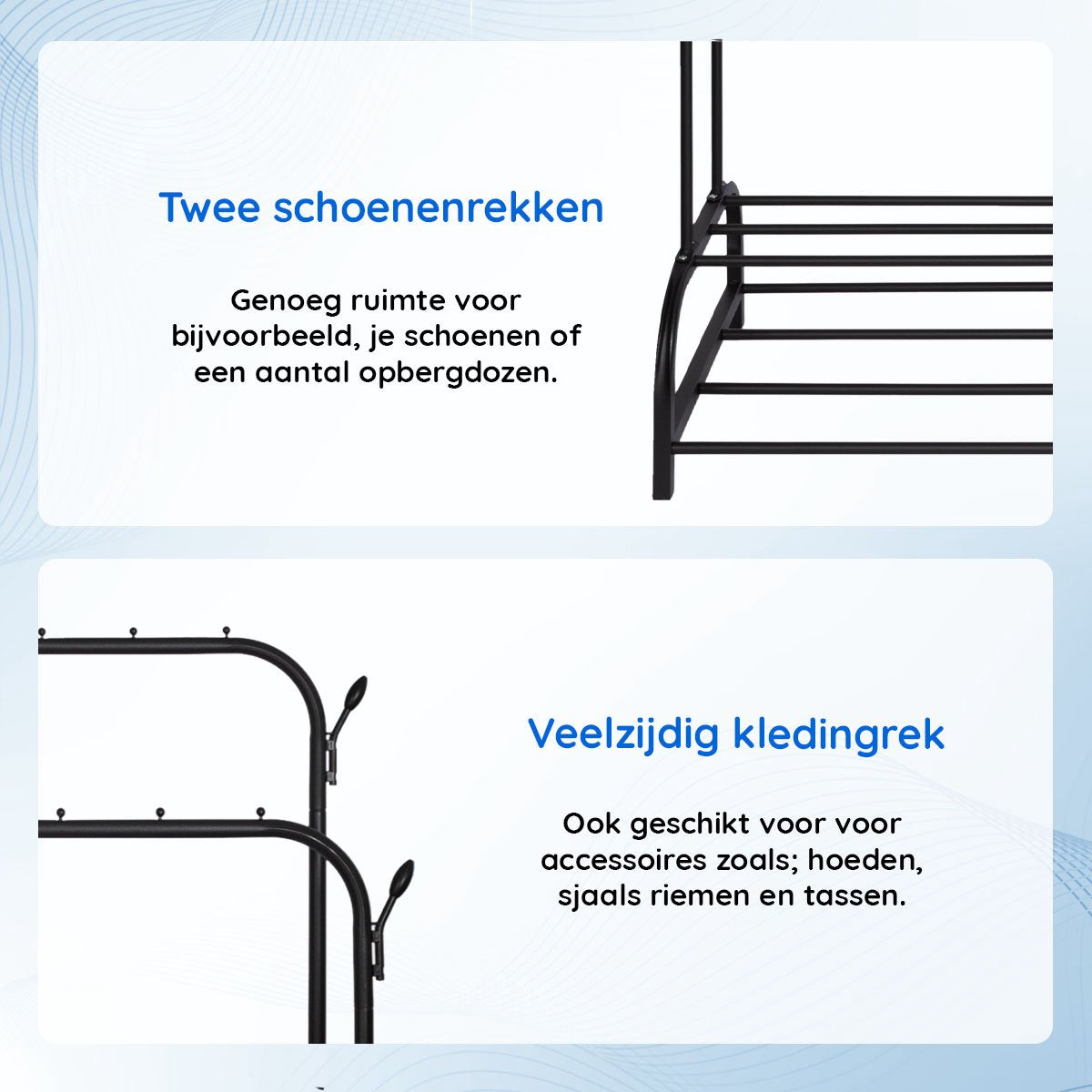 Eleganca Kledingrek – H157 x B110 x D56 cm – Garderoberek – Kledingrek metaal - Ruimtebesparend - Stijlvol en Functioneel - voor Kleding, Schoenen en Accessoires - 2 Kledingstangen - met 2 Planken en 4 Haken - Metaal - Zwart