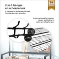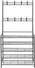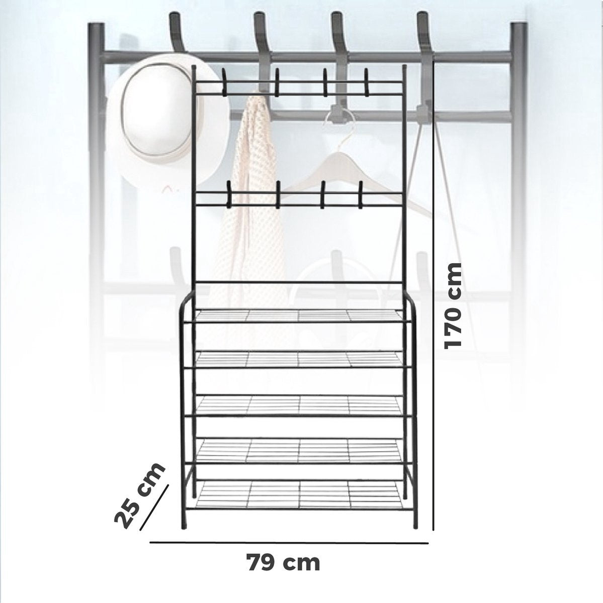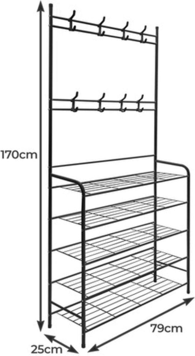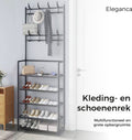 Je schoenen rond laten slingeren in de gang of hal is nu verleden tijd met het Eleganca kledingrek met planken voor schoenen. Met dit zwarte schoenenrek geef je 20 paar schoenen een mooie plek in huis. De 2-in-1 hanger- en schoenenrek is functioneel en neemt weinig ruimte in beslag. Dit praktische garderoberek met planken is van metaal gemaakt met de afmeting 170x79x25 cm. Het stevige kledingrek met planken is van hoge kwaliteit, zodat u geen zorgen hoeft te maken dat het omvalt. De klapstok met schoenenrek is uitgerust met 8 hangers en 5 planken die veel functies kunnen vervullen. Je kunt er zowel schoenen, tassen als kleding in opbergen of ophangen. Wacht niet langer en maak de gang of hal weer op orde met het Eleganca 2-in-1 kleding- en schoenenrek.