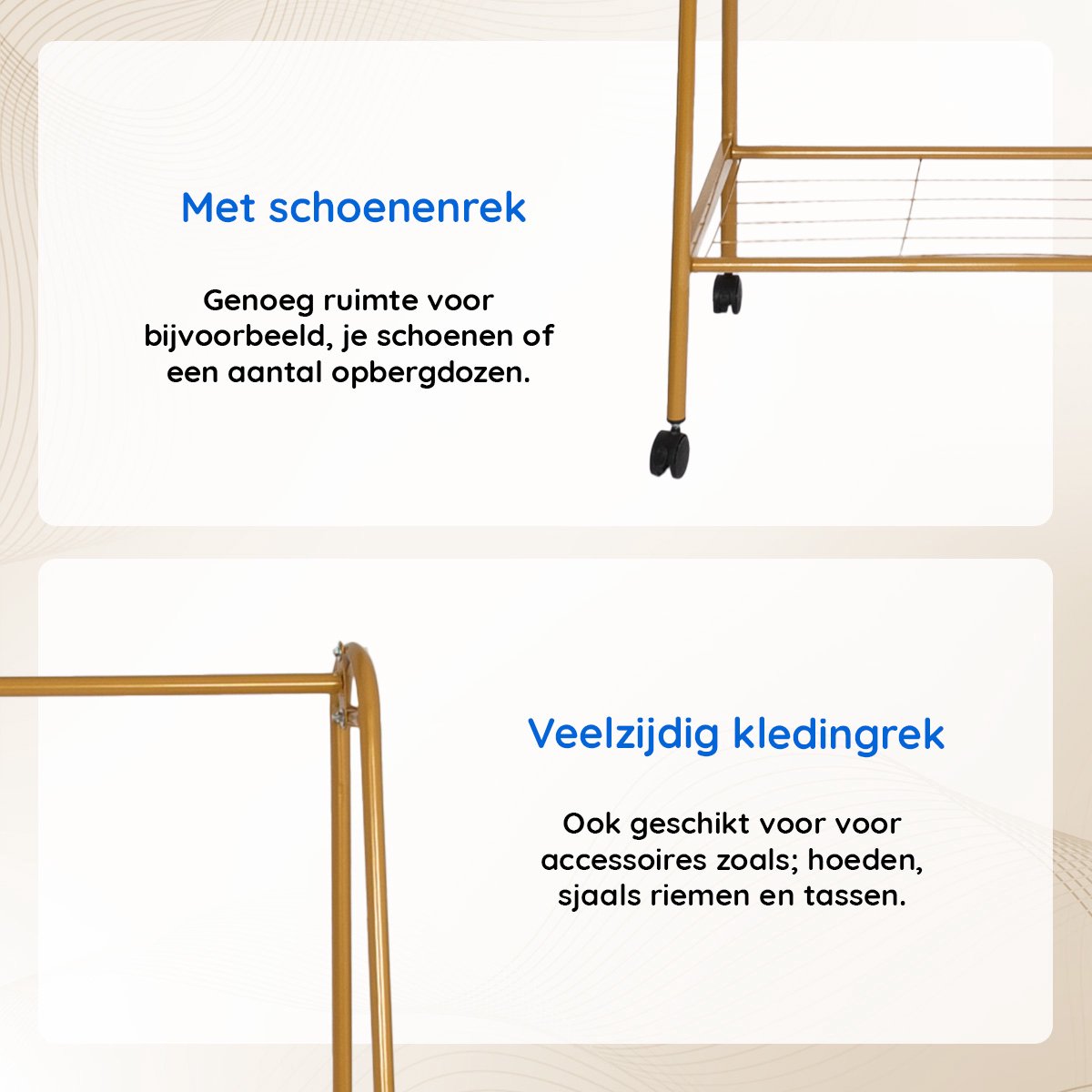 Naast het ophangen van kleding biedt het kledingrek extra opslagmogelijkheden, zoals een plank aan de onderzijde voor schoenen of accessoires. Hierdoor wordt het een veelzijdige oplossing voor het organiseren van diverse kledingstukken en items.