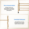 Naast het ophangen van kleding biedt het kledingrek extra opslagmogelijkheden, zoals planken voor schoenen of accessoires, waardoor het een veelzijdige oplossing is voor het organiseren van diverse kledingstukken en items.