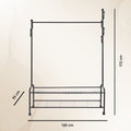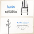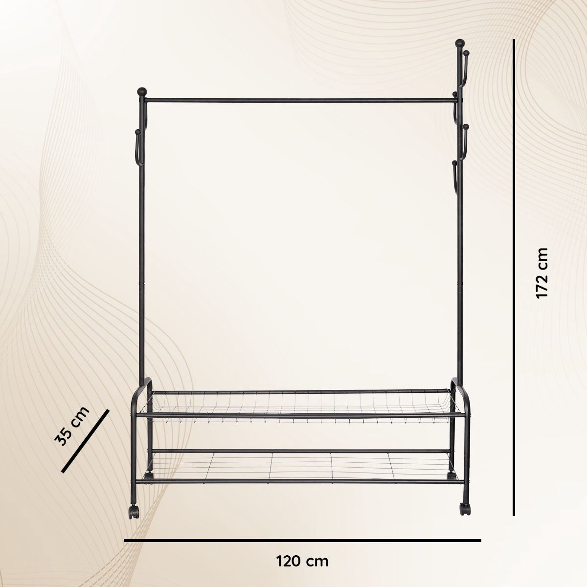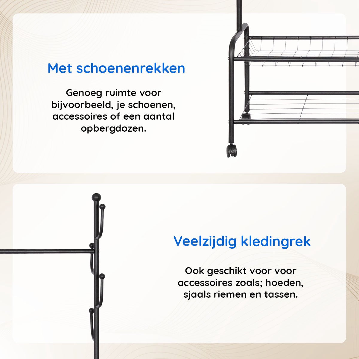 Naast het ophangen van kleding biedt het kledingrek extra opslagmogelijkheden, zoals planken voor schoenen of accessoires, waardoor het een veelzijdige oplossing is voor het organiseren van diverse kledingstukken en items.