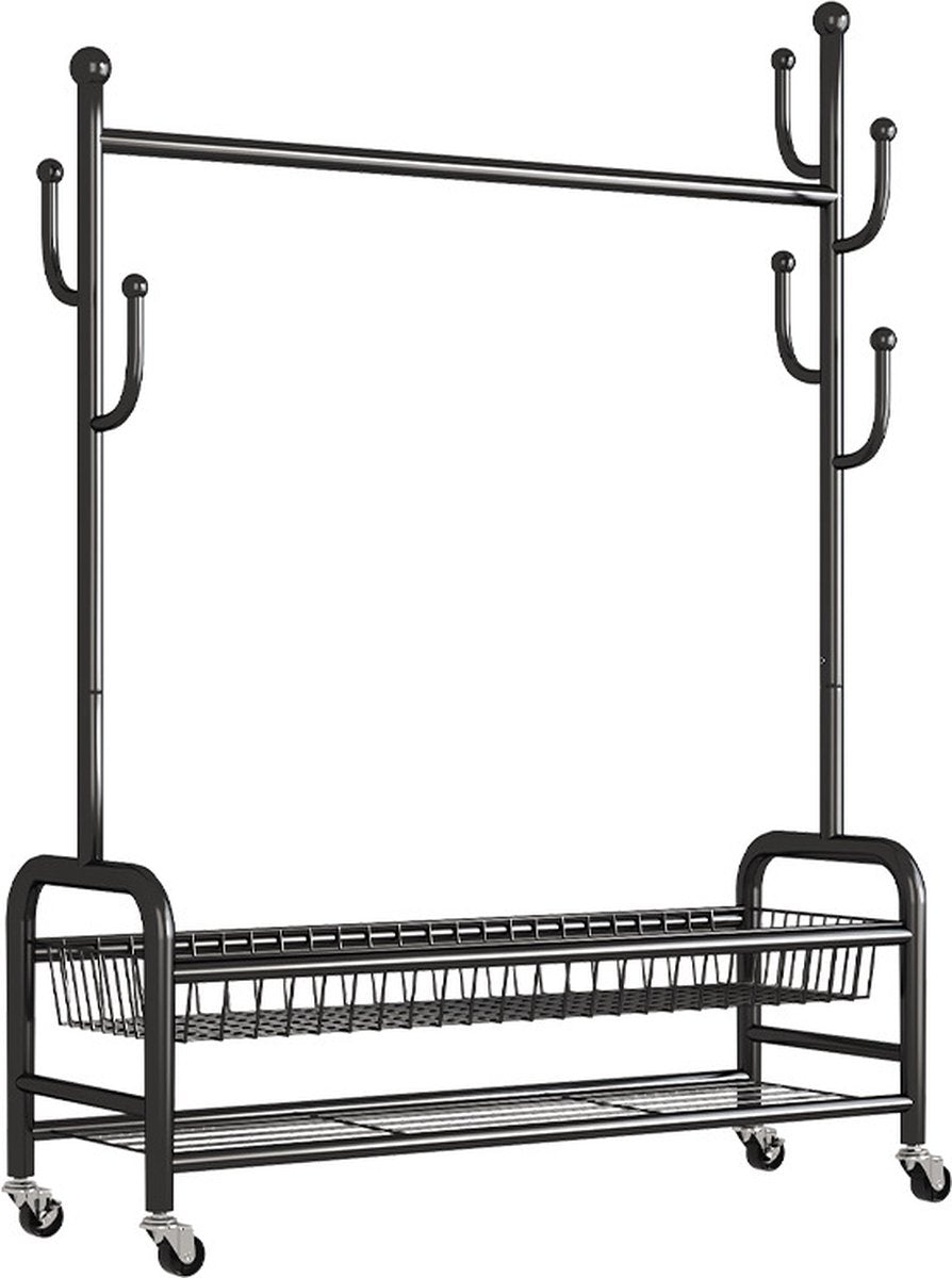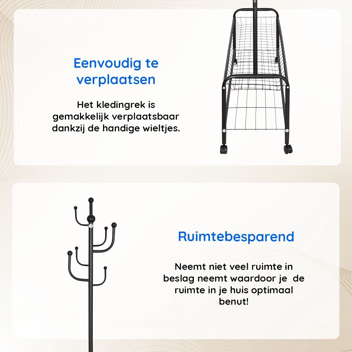 Eleganca Kledingrek op wieltjes - H172 x B120 x D35 cm - Kledingstang - Dressboy - Kledingrek metaal - Garderoberek met ophanghaken - Metaal - Zwart