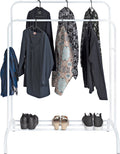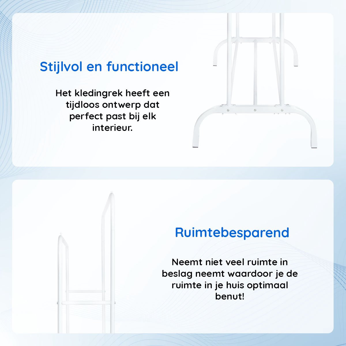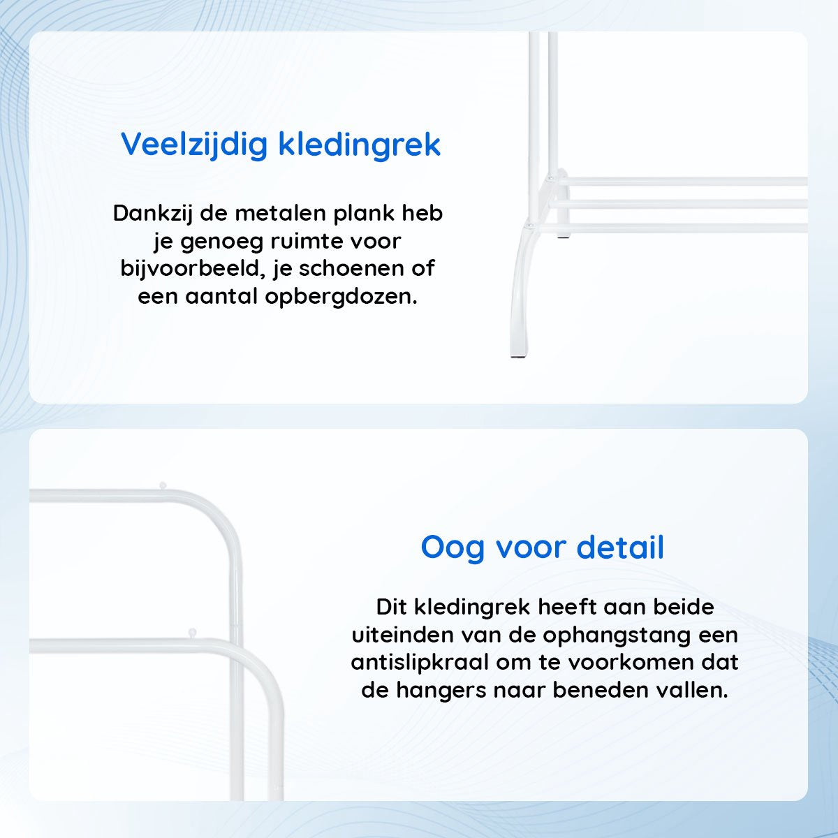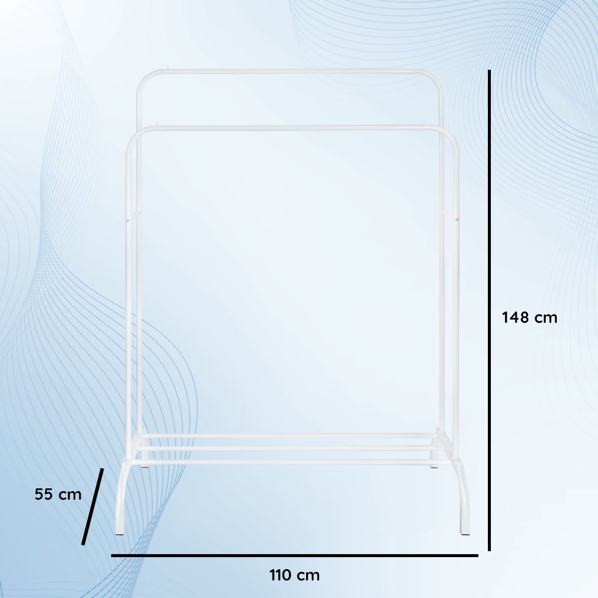 Eleganca Kledingrek wit – H148 x B110 x D55 cm – Garderoberek – Dressboy - Kledingrek metaal – Ruimtebesparend - Stijlvol en Functioneel – Kledingrek dubbel met 2 kledingstangen en schoenenplank - Stevige kledingrekken
