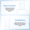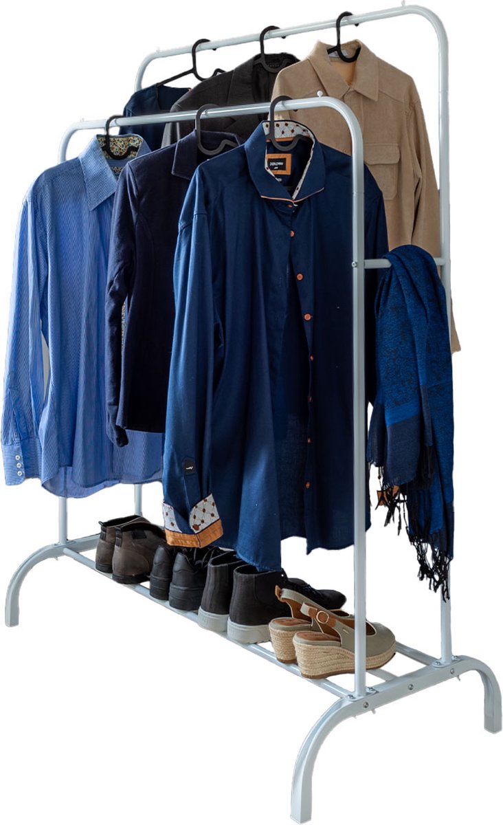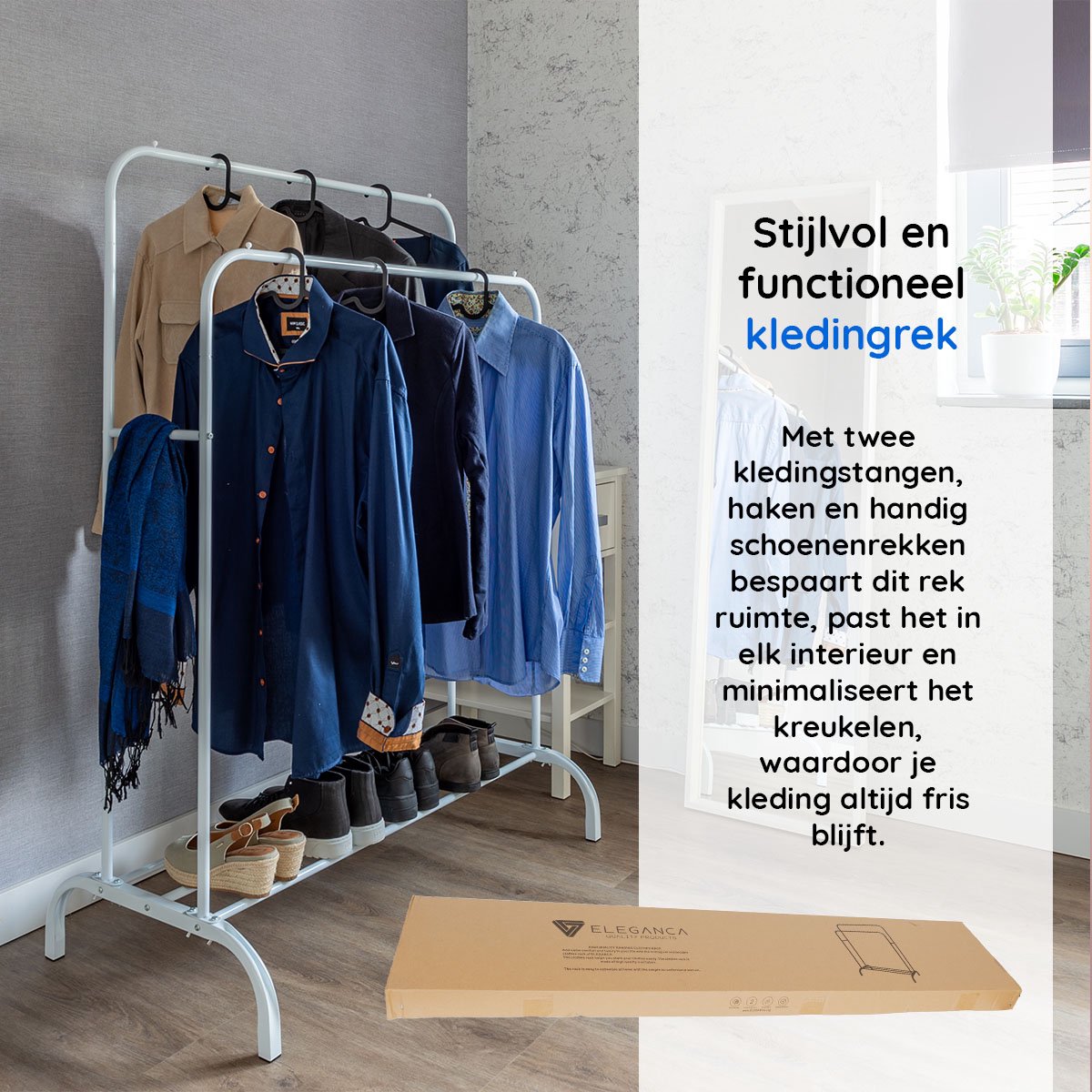 Ontdek het veelzijdige Eleganca kledingrek: perfect voor het organiseren van kleding én schoenen. Met twee kledingstangen en een handig schoenenrek bespaart dit rek ruimte, past het in elk interieur en minimaliseert het kreukelen, waardoor je kleding altijd fris blijft.