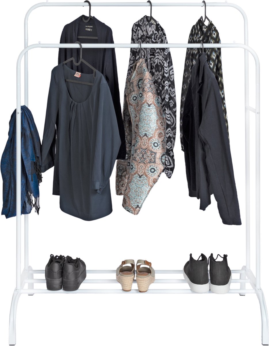 Ideaal aan dit kledingrek, is dat het niet alleen geschikt is voor kleding, maar ook voor schoenen. Het is namelijk een veelzijdig kledingrek met twee kledingstangen en een schoenenrek. Dankzij de metalen plank biedt het garderoberek ook nog eens genoeg ruimte voor bijvoorbeeld, je schoenen of een aantal opbergdozen.