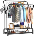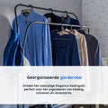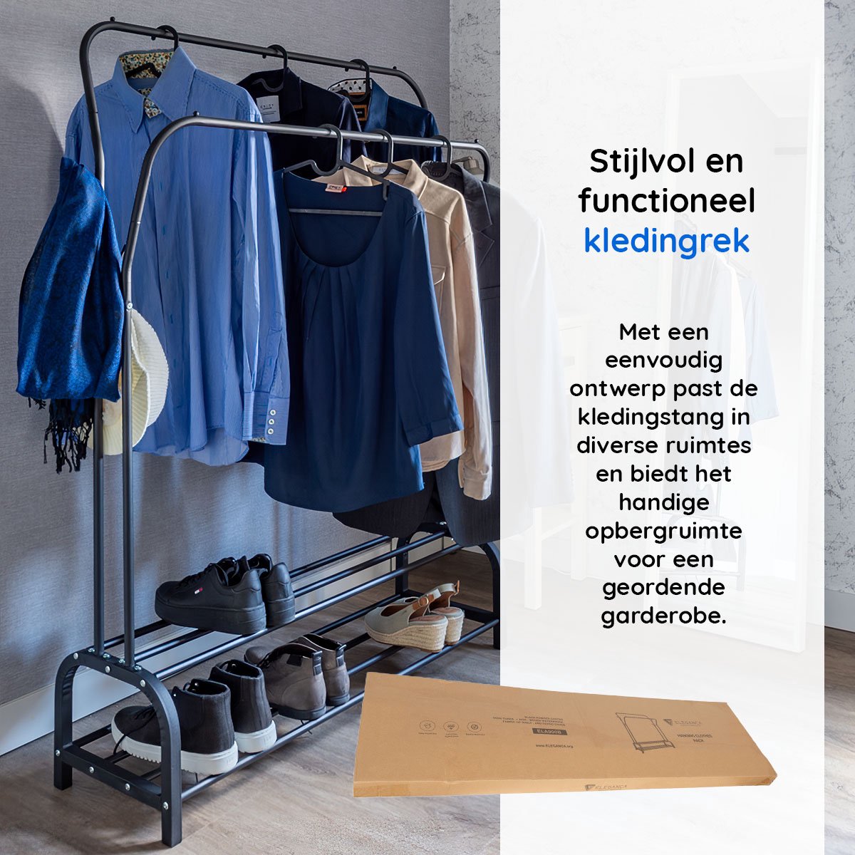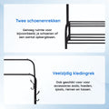 Naast het ophangen van kleding biedt het kledingrek extra opslagmogelijkheden, zoals planken voor schoenen of accessoires, waardoor het een veelzijdige oplossing is voor het organiseren van diverse kledingstukken en items.