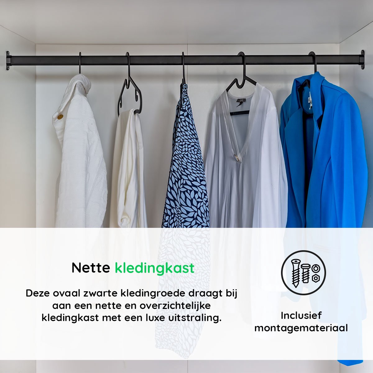 Deze ovaal zwarte aluminium kledingroede, inclusief kastroededragers, draagt bij aan een nette en overzichtelijke kledingkast met een luxe uitstraling. Deze fraaie Eleganca kledingstang is eenvoudig te monteren in kledingkasten, met een minimale wanddikte van 16mm. Door de luxe mat zwarte afwerking kan de roede ook gebruikt worden in een inloopkast en fungeert deze goed als garderobestang voor zware jassen. De garderobebuis is extra stevig en zwaar, zodat u veel en zware kleding op de kleerstang kunt ophangen. Zowel de kledingdrager als de bijpassende steuntjes hebben een mooie mat zwarte afwerking. De 2 meegeleverde zijwandhouders zijn makkelijk met schroeven te bevestigen en zorgen ervoor dat de kleerstang snel en makkelijk te monteren is.