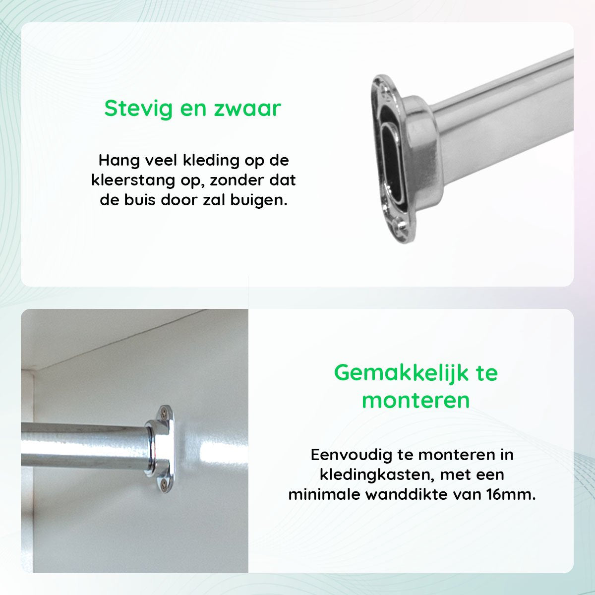 Deze ovaal verchoomd stalen kledingroede, inclusief kastroededragers, draagt bij aan een nette en overzichtelijke kledingkast met een luxe uitstraling. Deze fraaie Eleganca kledingstang – kledingroede – chroom extra stevig – ophangen van kleding – 1,2m – inclusief kastroededragers is eenvoudig te monteren in kledingkasten, met een minimale wanddikte van 16mm. Door de luxe chrome afwerking kan de roede ook gebruikt worden in een inloopkast en fungeert deze goed als garderobestang voor jassen. De garderobebuis is extra stevig en zwaar, zodat u veel kleding op de kleerstang kunt ophangen. Zowel de kledingdrager als de bijpassende steuntjes hebben een mooie mat chrome afwerking. De 2 meegeleverde zijwandhouders zijn makkelijk met schroeven te bevestigen en zorgen ervoor dat de kleerstang snel en makkelijk te monteren is.