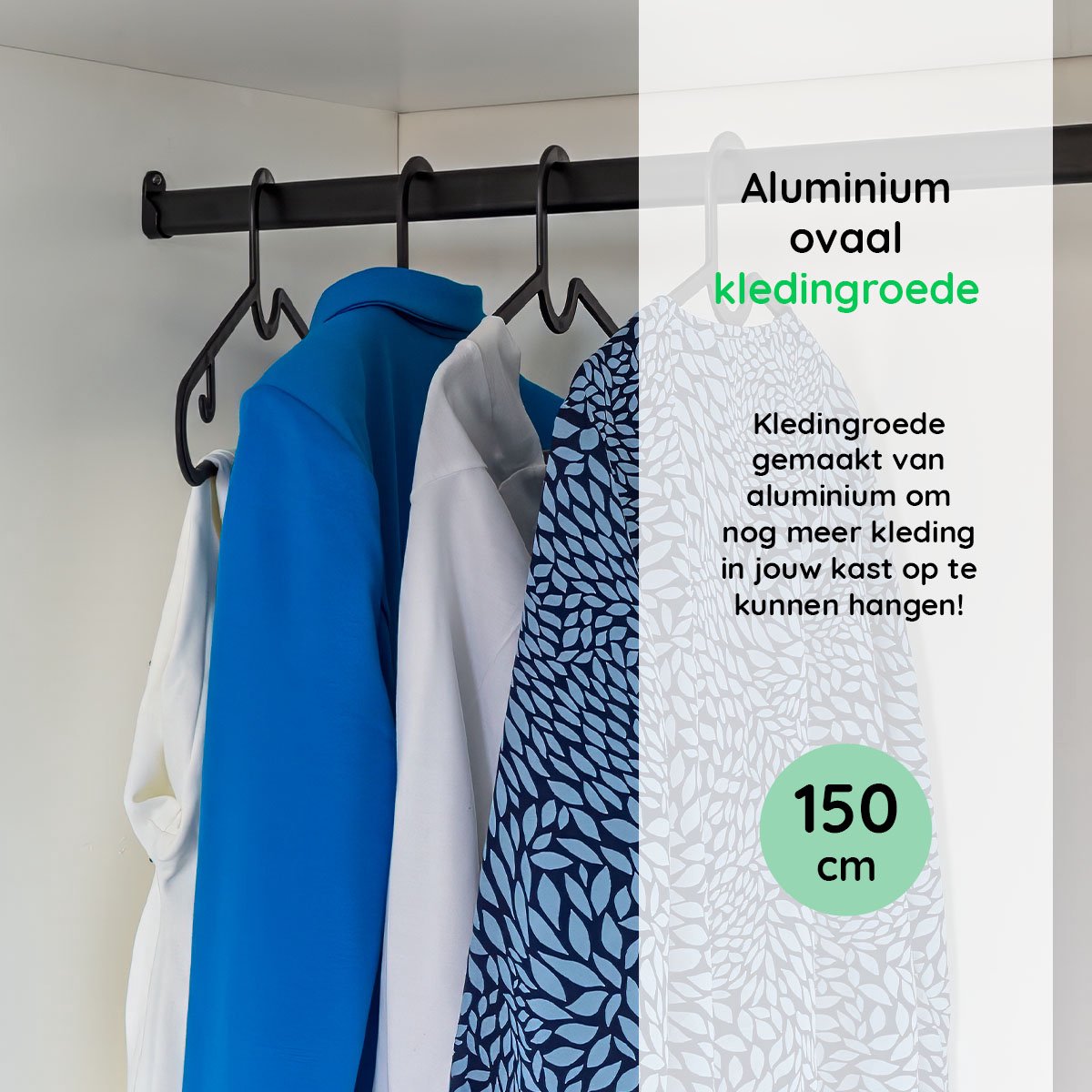 Deze ovaal zwarte aluminium kledingroede, inclusief kastroededragers, draagt bij aan een nette en overzichtelijke kledingkast met een luxe uitstraling. Deze fraaie is eenvoudig te monteren in kledingkasten, met een minimale wanddikte van 16mm. Door de luxe mat zwarte afwerking kan de roede ook gebruikt worden in een inloopkast en fungeert deze goed als garderobestang voor zware jassen. De garderobebuis is extra stevig en zwaar, zodat u veel en zware kleding op de kleerstang kunt ophangen. Zowel de kledingdrager als de bijpassende steuntjes hebben een mooie mat zwarte afwerking. De 2 meegeleverde zijwandhouders zijn makkelijk met schroeven te bevestigen en zorgen ervoor dat de kleerstang snel en makkelijk te monteren is.