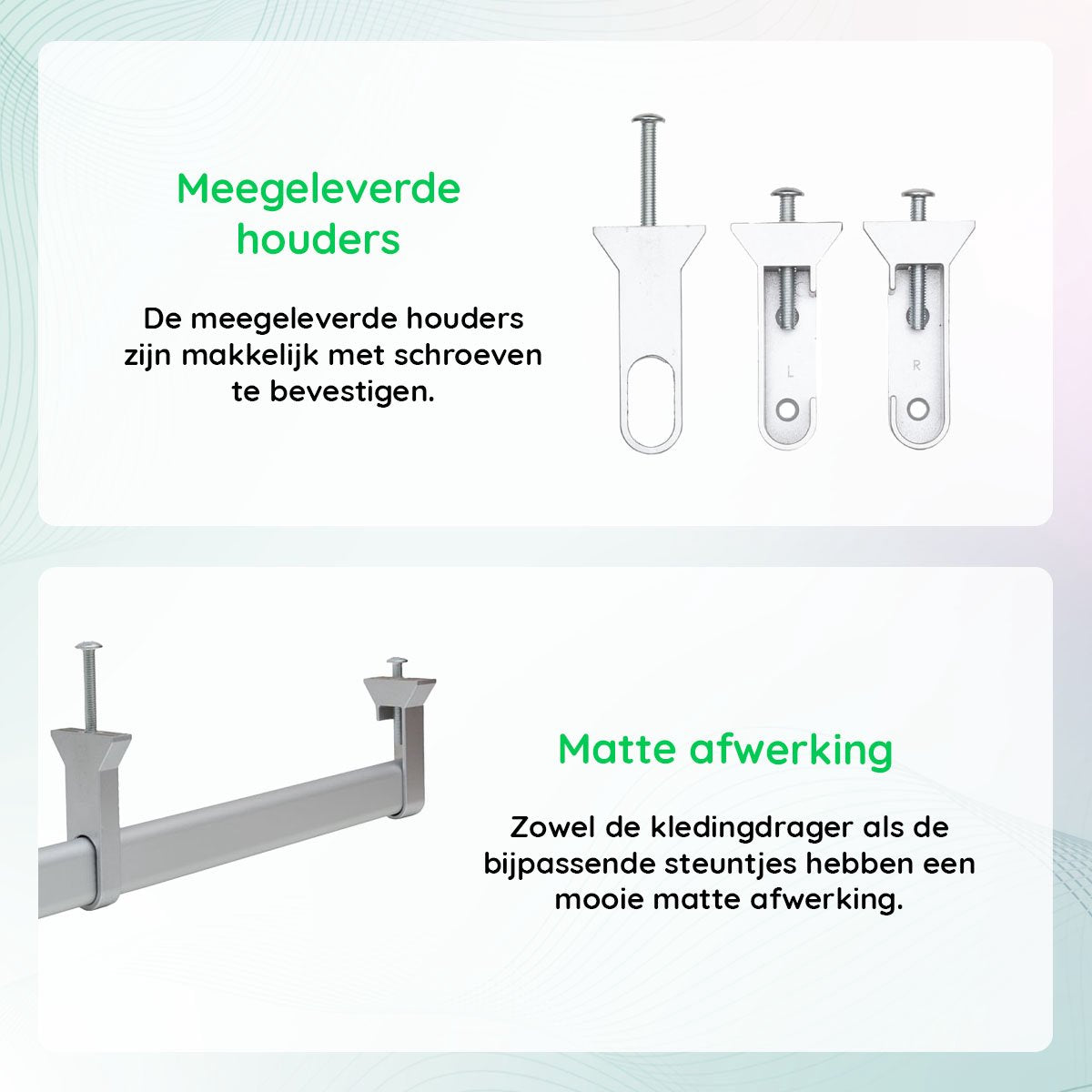 Een eenvoudig te monteren aan een plank aluminium kledingstang, met een verminderde kans op doorbuigen dankzij de extra midden steun.