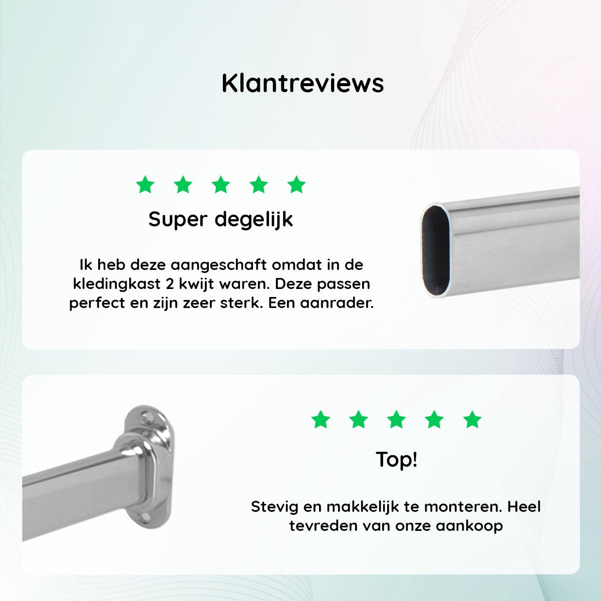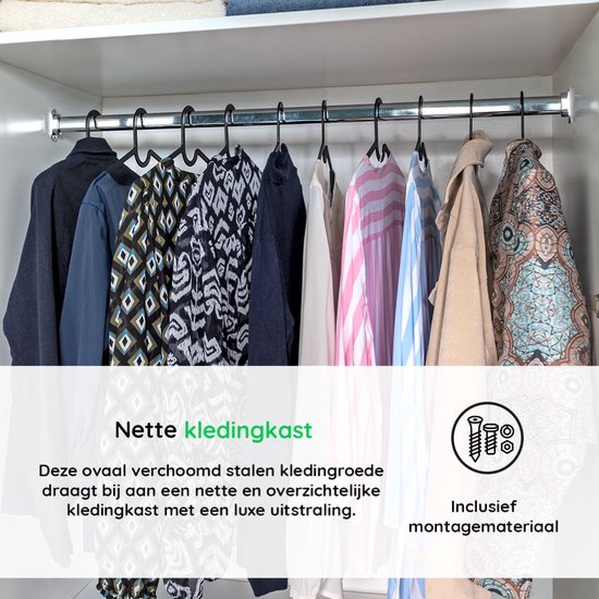 Deze ovaal verchoomd stalen kledingroede, inclusief kastroededragers, draagt bij aan een nette en overzichtelijke kledingkast met een luxe uitstraling. Deze fraaie Eleganca Kledingstang – kledingroede – chroom extra stevig – ophangen van kleding – 2m – inclusief kastroededragers is eenvoudig te monteren in kledingkasten, met een minimale wanddikte van 16mm. Door de luxe chrome afwerking kan de roede ook gebruikt worden in een inloopkast en fungeert deze goed als garderobestang voor jassen. De garderobebuis is extra stevig en zwaar, zodat u veel kleding op de kleerstang kunt ophangen. Zowel de kledingdrager als de bijpassende steuntjes hebben een mooie mat chrome afwerking. De 2 meegeleverde zijwandhouders zijn makkelijk met schroeven te bevestigen en zorgen ervoor dat de kleerstang snel en makkelijk te monteren is.