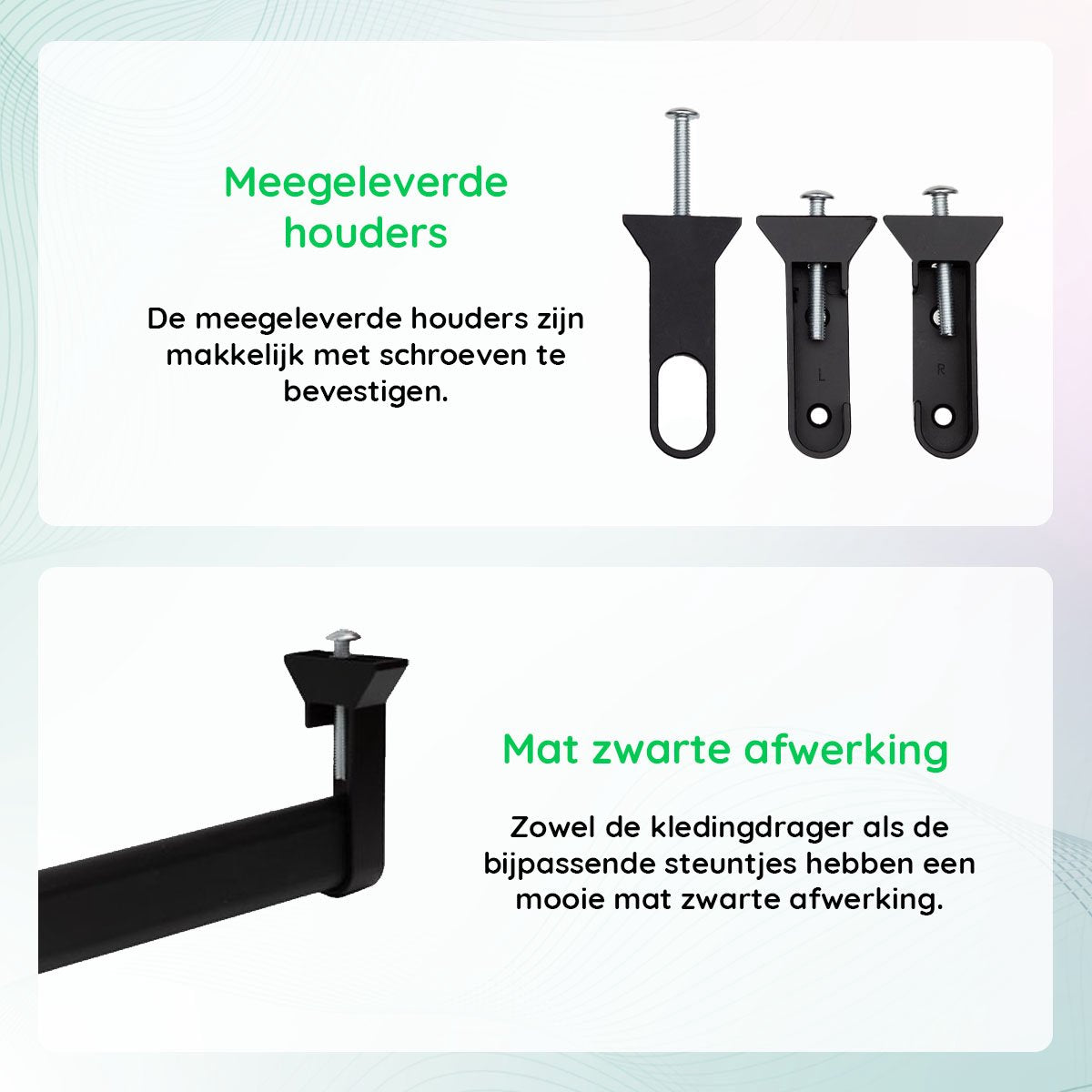 Onze extra sterke metalen kledingroede is ontworpen om zelfs de zwaarste ladingen te weerstaan, zodat u al uw kleding met vertrouwen kunt ophangen. Met twee eindstukken en een midden steunstuk is onze kledingroede meer dan alleen een plek om je kleding op te hangen - het is een solide meubelstuk dat jarenlang gebruik zal doorstaan.