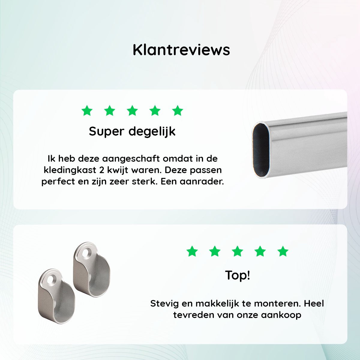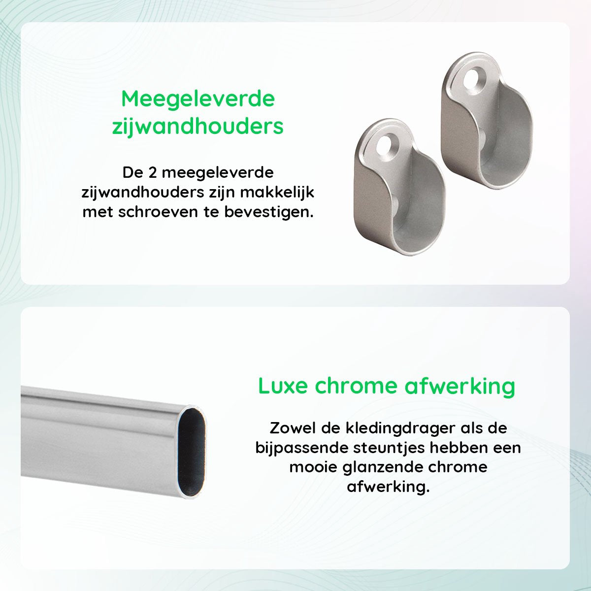 Deze ovaal verchoomd stalen kledingroede, inclusief kastroededragers, draagt bij aan een nette en overzichtelijke kledingkast met een luxe uitstraling. Deze fraaie Eleganca kledingstang – kledingroede – chroom extra stevig – ophangen van kleding – 90 cm – inclusief kastroededragers is eenvoudig te monteren in kledingkasten, met een minimale wanddikte van 16mm. Door de luxe chrome afwerking kan de roede ook gebruikt worden in een inloopkast en fungeert deze goed als garderobestang voor jassen. De garderobebuis is extra stevig en zwaar, zodat u veel kleding op de kleerstang kunt ophangen. Zowel de kledingdrager als de bijpassende steuntjes hebben een mooie mat chrome afwerking. De 2 meegeleverde zijwandhouders zijn makkelijk met schroeven te bevestigen en zorgen ervoor dat de kleerstang snel en makkelijk te monteren is.