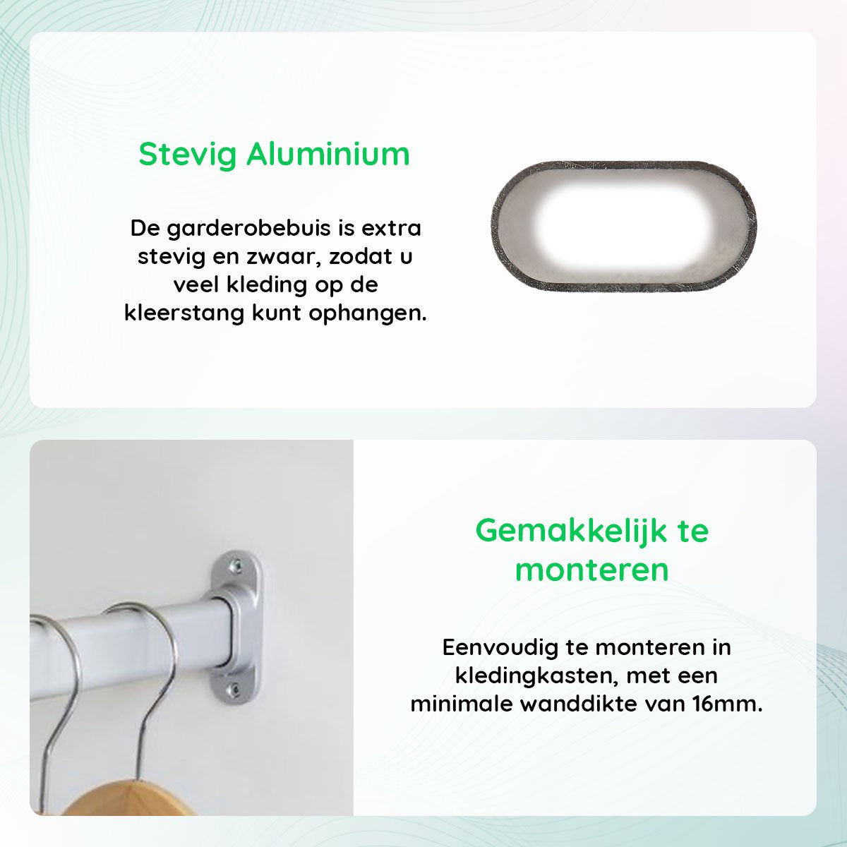 Deze van aluminium ovale kledingroede, inclusief kastroededragers, draagt bij aan een nette en overzichtelijke kledingkast met een luxe uitstraling. Deze fraaie Eleganca kledingstang – kledingroede – extra stevig aluminium – ophangen van kleding – 90 cm – inclusief kastroededragers is eenvoudig te monteren in kledingkasten, met een minimale wanddikte van 16mm. Door de luxe matte zilveren afwerking kan de roede ook gebruikt worden in een inloopkast en fungeert deze goed als garderobestang voor jassen. De garderobebuis is extra stevig en zwaar, zodat u veel kleding op de kleerstang kunt ophangen. Zowel de kledingdrager als de bijpassende steuntjes hebben een mooie mat zilveren afwerking. De 2 meegeleverde zijwandhouders zijn makkelijk met schroeven te bevestigen en zorgen ervoor dat de kleerstang snel en makkelijk te monteren is.