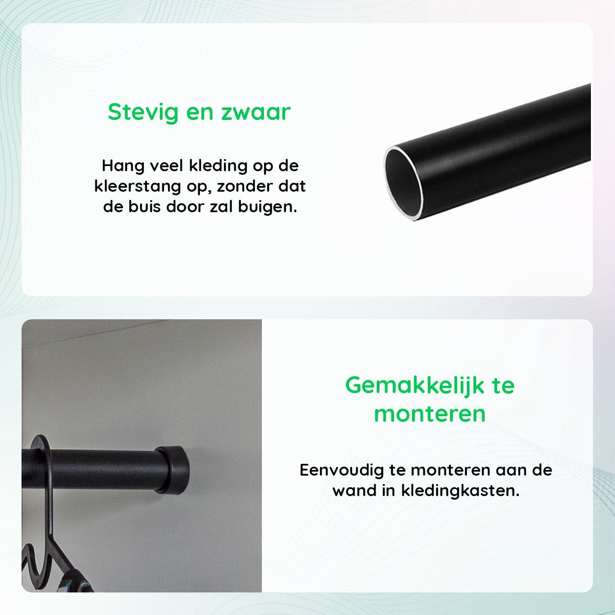 Deze van aluminium ronde kledingroede, inclusief kastroededragers, draagt bij aan een nette en overzichtelijke kledingkast met een luxe uitstraling. Deze fraaie kledingstang is eenvoudig te monteren in kledingkasten. Door de luxe matte zwarte afwerking kan de roede ook gebruikt worden in een inloopkast en fungeert deze goed als garderobestang voor jassen. De garderobebuis is extra stevig en zwaar, zodat u veel kleding op de kleerstang kunt ophangen. Zowel de kledingdrager als de bijpassende steuntjes hebben een mooie mat zwarte afwerking. De 2 meegeleverde zijwandhouders zijn makkelijk met schroeven te bevestigen en zorgen ervoor dat de kleerstang snel en makkelijk te monteren is.