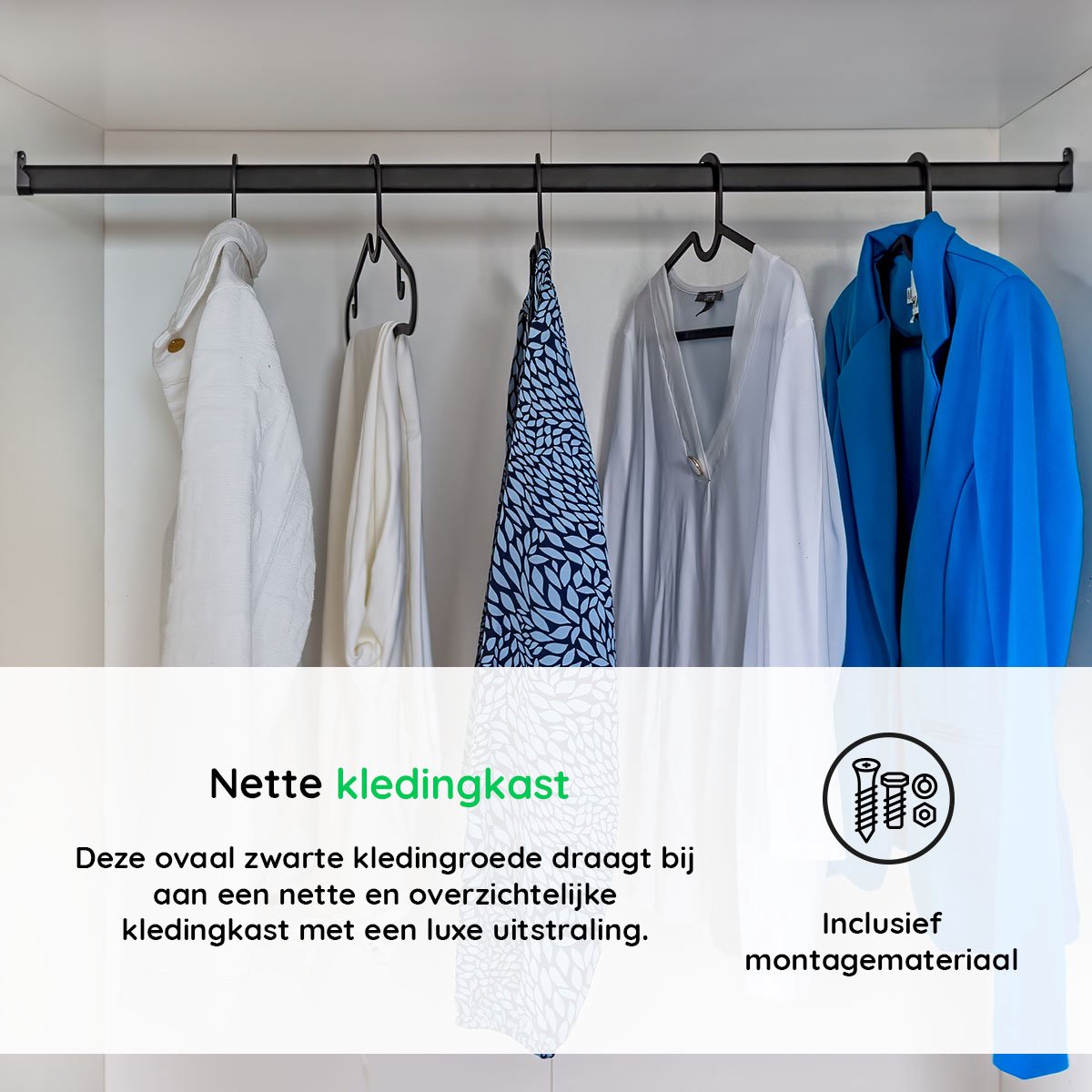 Deze ovaal zwarte aluminium kledingroede, inclusief kastroededragers, draagt bij aan een nette en overzichtelijke kledingkast met een luxe uitstraling. Deze fraaie kledingstang is eenvoudig te monteren in kledingkasten, met een minimale wanddikte van 16mm. Door de luxe mat zwarte afwerking kan de roede ook gebruikt worden in een inloopkast en fungeert deze goed als garderobestang voor zware jassen. De garderobebuis is extra stevig en zwaar, zodat u veel en zware kleding op de kleerstang kunt ophangen. Zowel de kledingdrager als de bijpassende steuntjes hebben een mooie mat zwarte afwerking. De 2 meegeleverde zijwandhouders zijn makkelijk met de bijgeleverde zwarte schroeven te bevestigen en zorgen ervoor dat de kleerstang snel en makkelijk te monteren is.