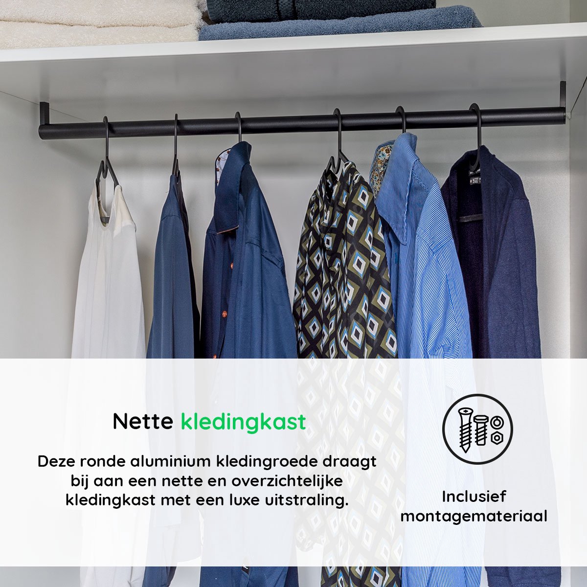 Deze van aluminium ronde kledingroede, inclusief kastroededragers, draagt bij aan een nette en overzichtelijke kledingkast met een luxe uitstraling. Deze fraaie kledingstang is eenvoudig te monteren in kledingkasten. Door de luxe matte zwarte afwerking kan de roede ook gebruikt worden in een inloopkast en fungeert deze goed als garderobestang voor jassen. De garderobebuis is extra stevig en zwaar, zodat u veel kleding op de kleerstang kunt ophangen. Zowel de kledingdrager als de bijpassende steuntjes hebben een mooie mat zwarte afwerking. De 2 meegeleverde houders, bedoeld voor montage onder een plank, zijn makkelijk met schroeven te bevestigen en zorgen ervoor dat de kleerstang snel en makkelijk te monteren is.