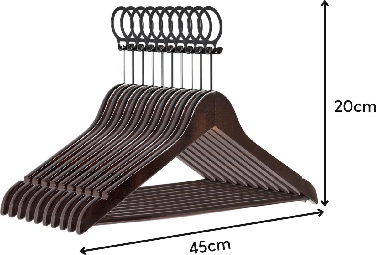 Het stevige houten materiaal zorgt ervoor dat de kleerhangers erg sterk zijn. Zo kunt u zonder zorgen zware kledingstukken aan de hangers ophangen.