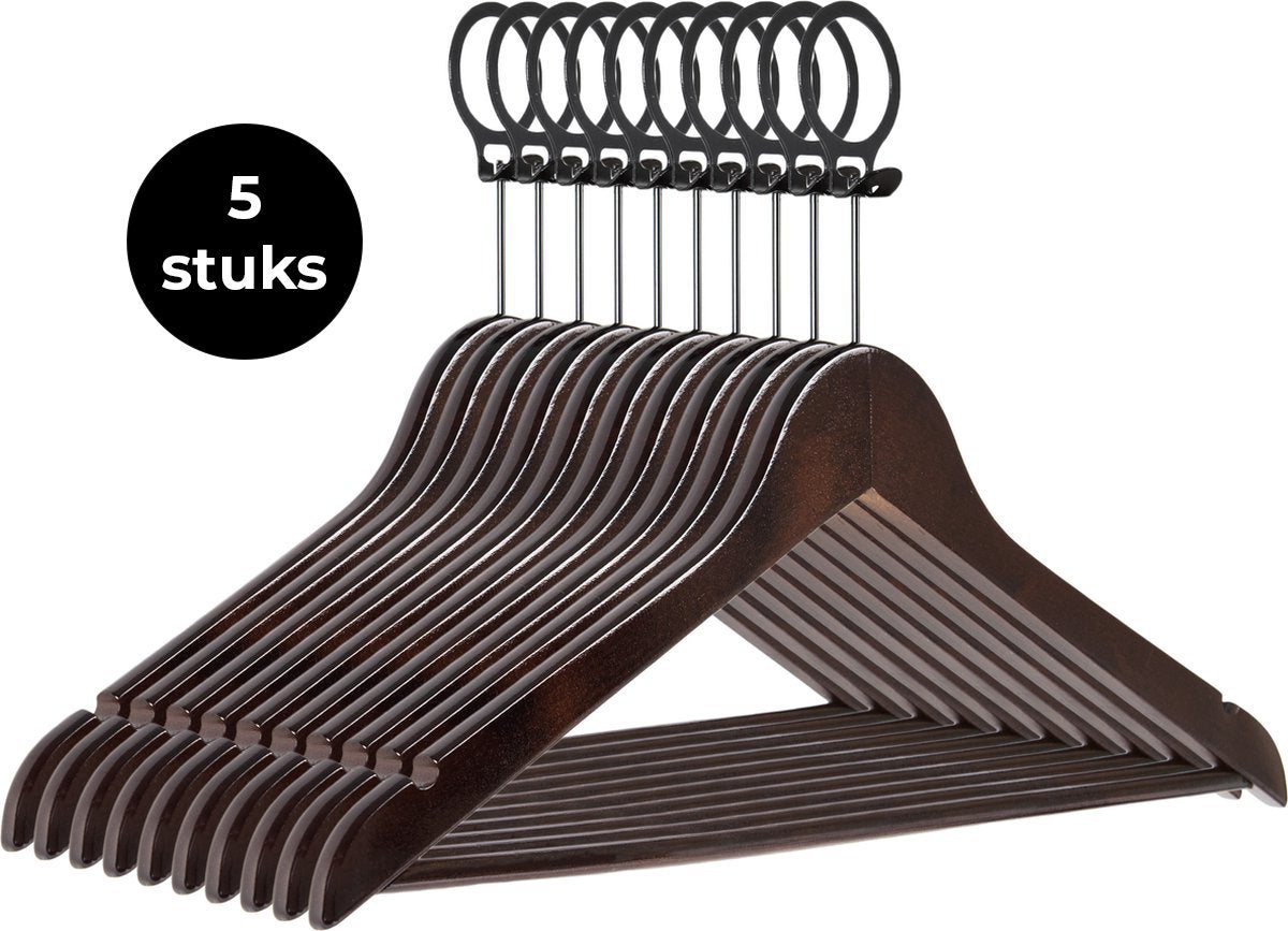 Eleganca luxe kleerhangers 5 stuks- vintage kleur- A kwaliteit behandeld hout - multifunctionele kledinghanger met anti diefstal ring - optimaal voor jassen en mantels