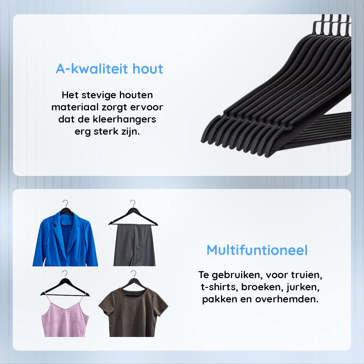 Het stevige houten materiaal zorgt ervoor dat de kleerhangers erg sterk zijn. Zo kunt u zonder zorgen zware kledingstukken aan de hangers ophangen.