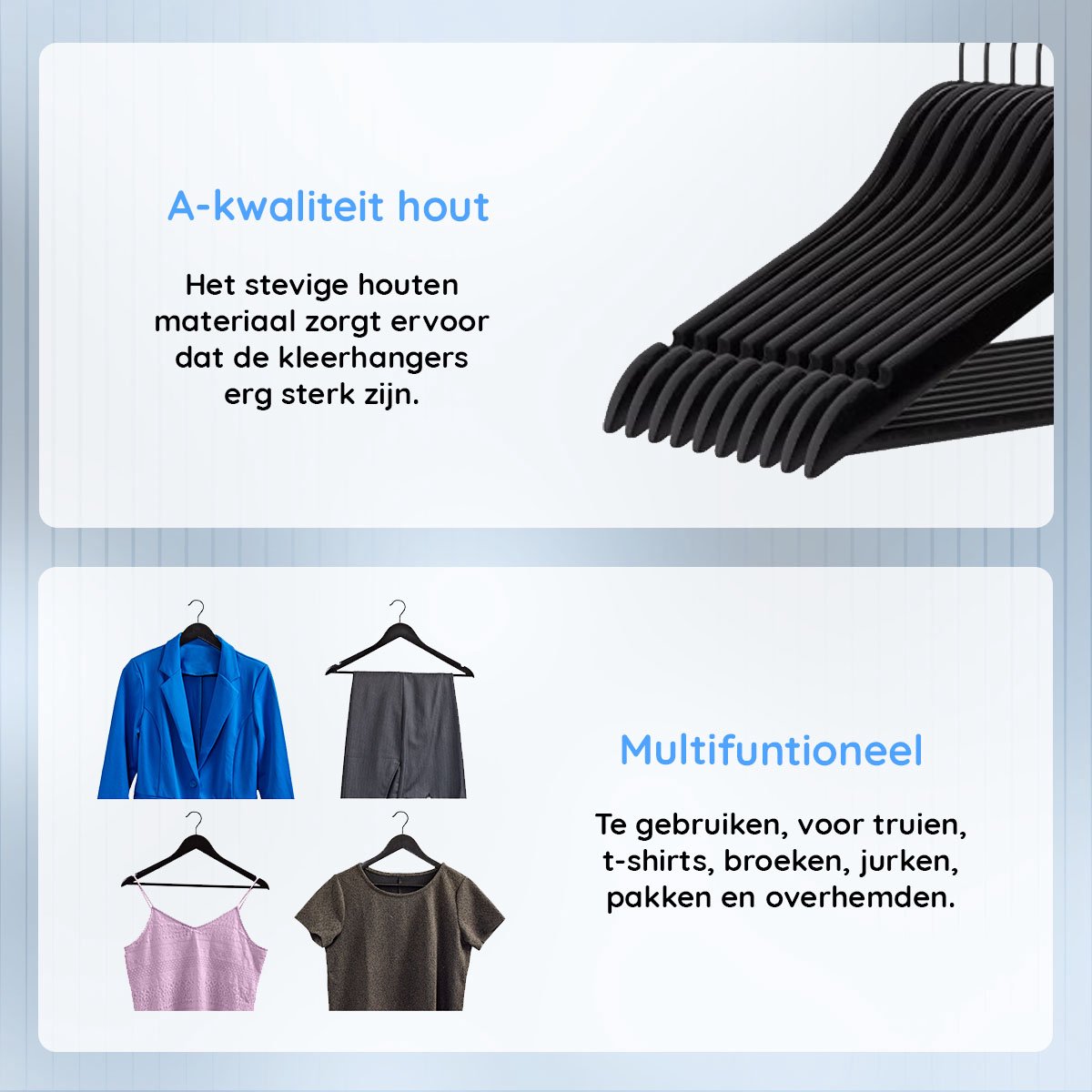 Het stevige houten materiaal zorgt ervoor dat de kledinghangers erg sterk zijn. Zo kunt u zonder zorgen zware kledingstukken aan de hangers ophangen.