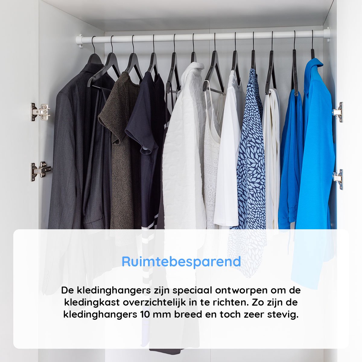 De kledinghangers zijn speciaal ontworpen om de kledingkast overzichtelijk in te richten. Zo zijn de kledinghangers 10 mm breed en toch zeer stevig.