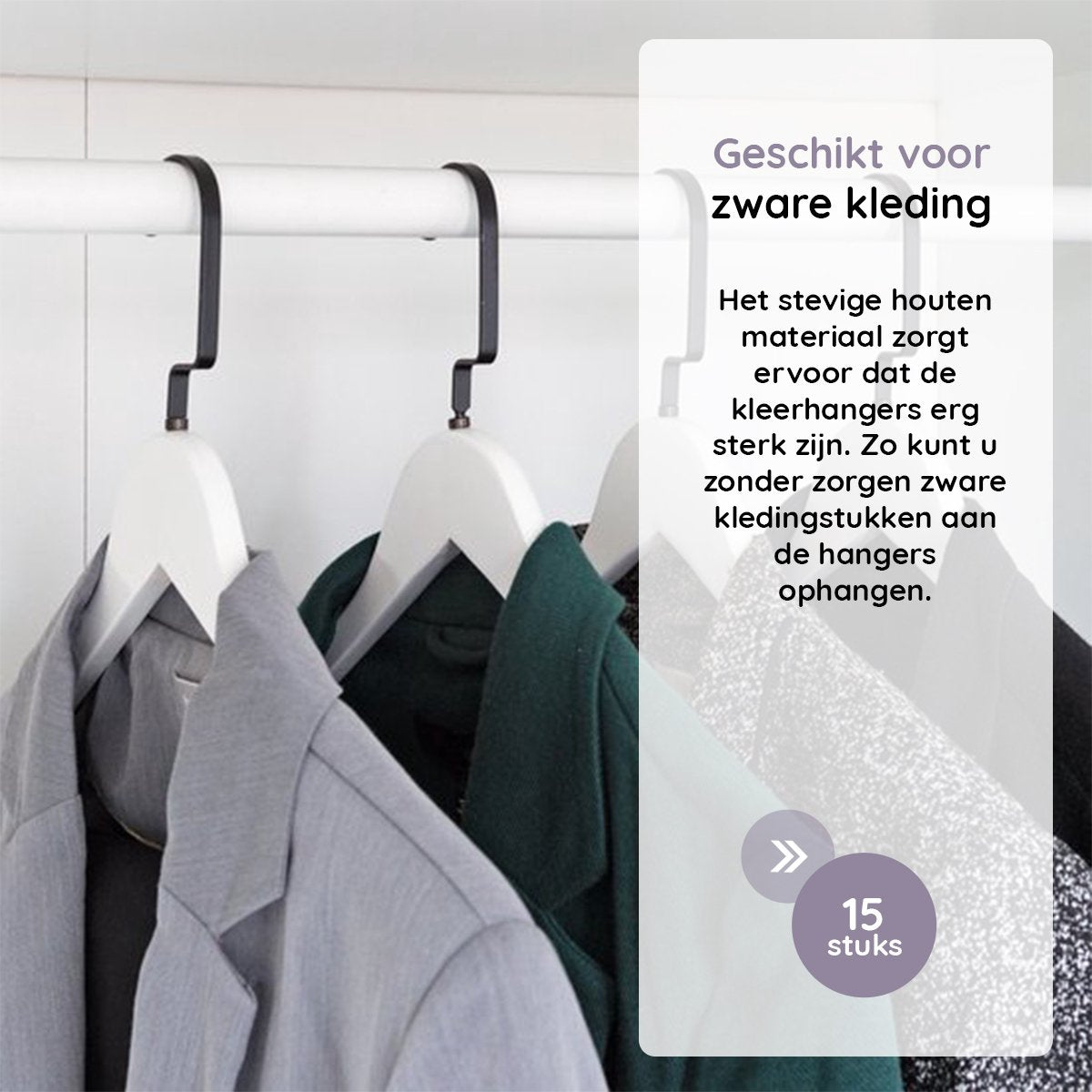Eleganca luxe kleerhangers - Kledinghanger - 15 stuks - Behandeld hout - 45x26 x1cm - Multifunctionele kledinghanger - Gelakt - Met platte zwarte haak - Wit