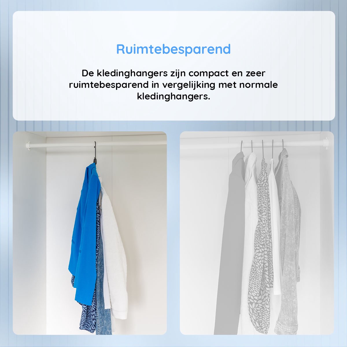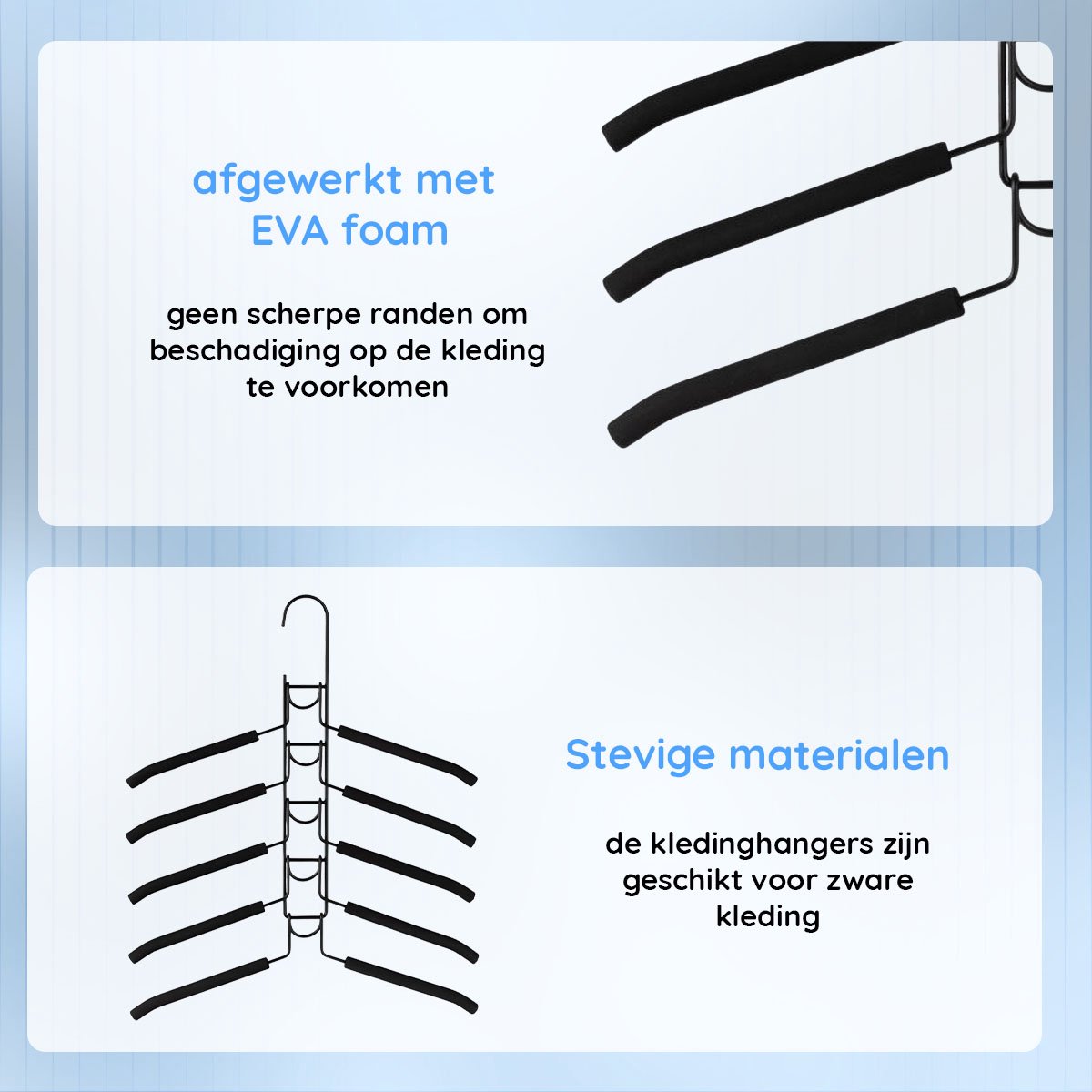 De hanger is zo ontworpen dat je reguliere kleding elkaar niet overlapt en netjes blijft. Hierdoor is de kledinghanger ook multifunctioneel te gebruiken voor truien, t-shirts, jasjes en overhemden. De hangers zijn gemaakt van metaal en de middenstukken van de hanger zijn afgewerkt met EVA foam. Dankzij het EVA foam zitten er geen scherpe randen aan de kledinghangers om beschadiging op de kleding te voorkomen.