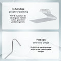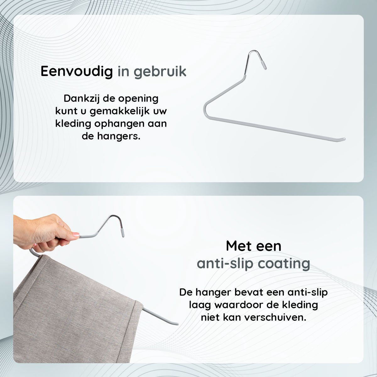 Deze elegante metaal verchroomde pantalonhangers zijn ideaal om uw kledingkast geordend in te delen. De kledinghangers zijn geschikt voor het netjes ophangen van broeken, shawls, topjes, accessoires en meer. De grijze broekhangers zijn gemaakt met stevig grijs kunststof, zodat er geen scherpe randen aan de kledinghangers zijn, waardoor kleding kan beschadigen. Hiernaast werkt het kunststof als een anti-slip laag, waardoor de kleding niet kan verschuiven.