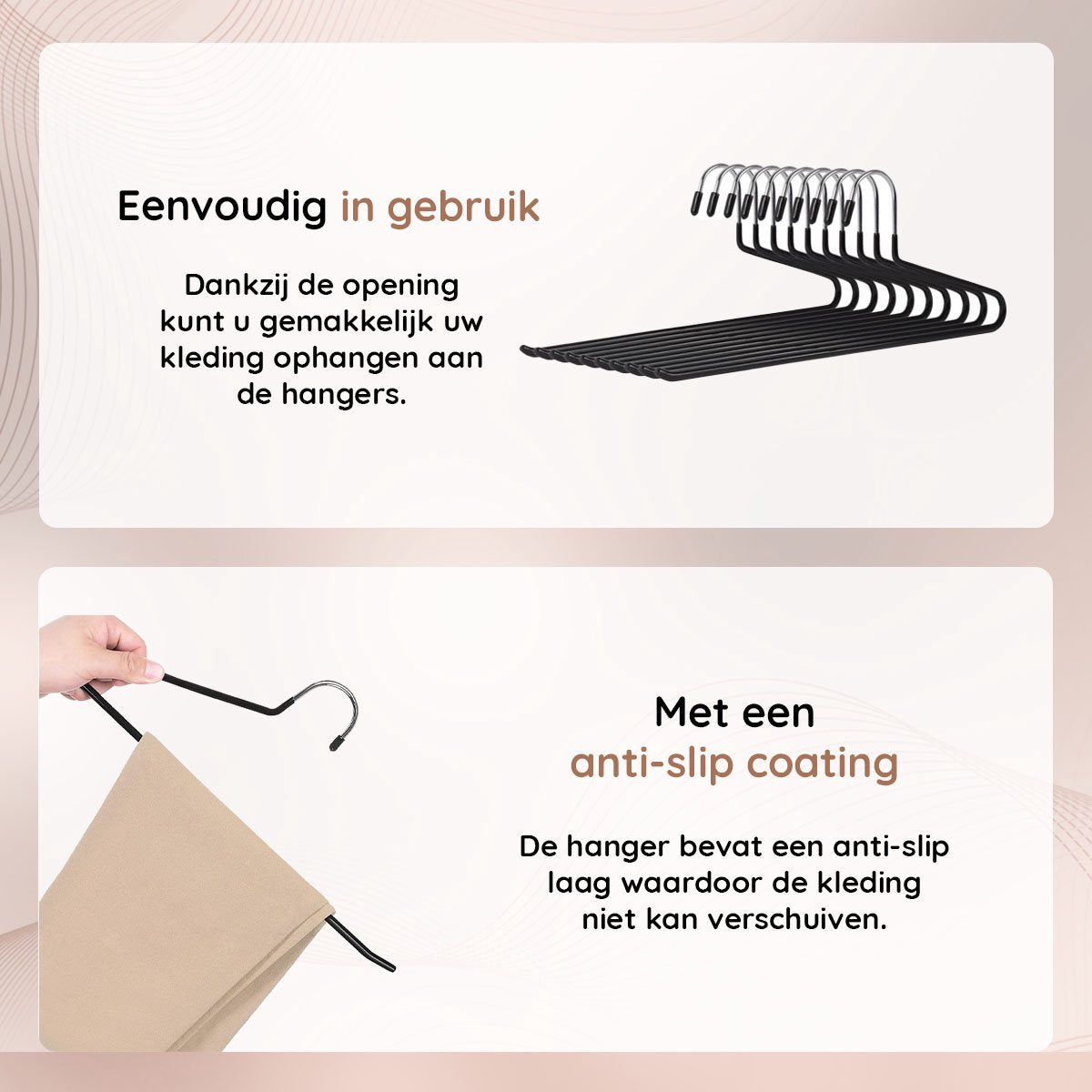Deze elegante metaal verchroomde pantalonhangers zijn ideaal om uw kledingkast geordend in te delen. De kledinghangers zijn geschikt voor het netjes ophangen van broeken, shawls, topjes, accessoires en meer. De zwarte broekhangers zijn gemaakt met stevig zwart kunststof, zodat er geen scherpe randen aan de kledinghangers zijn waardoor kleding kan beschadigen. Hiernaast werkt het kunststof als een anti-slip laag, waardoor de kleding niet kan verschuiven.
