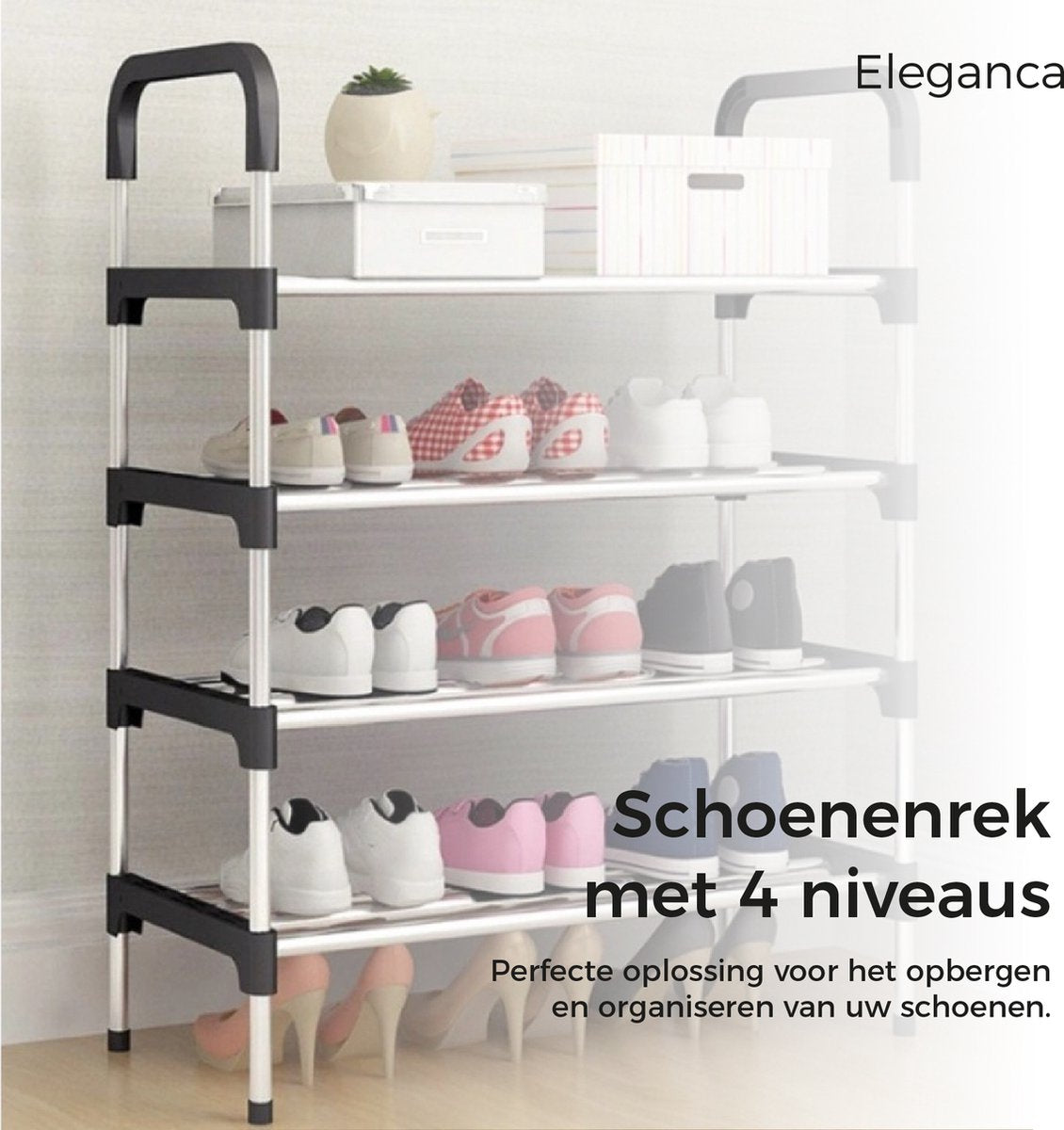 Heeft u een klein huis en staan uw schoenen eigenlijk altijd in de weg? Dan is het schoenenrek van Eleganca de ideale oplossing. Met het schoenenrek heeft u maar liefst genoeg opbergruimte voor 16 paar schoenen.