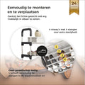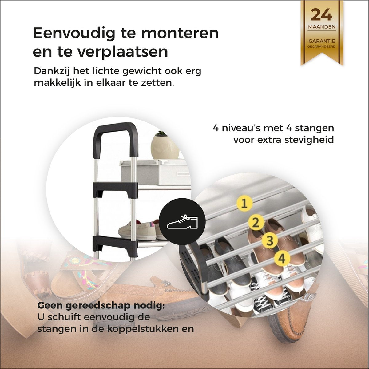 Om het schoenenrek in elkaar te zetten heeft u geen gereedschap nodig. U schuift eenvoudig de stangen in de koppelstukken en duwt deze stevig aan om te garanderen dat ze goed vast zitten. Hierdoor is het rek ook super eenvoudig te demonteren.