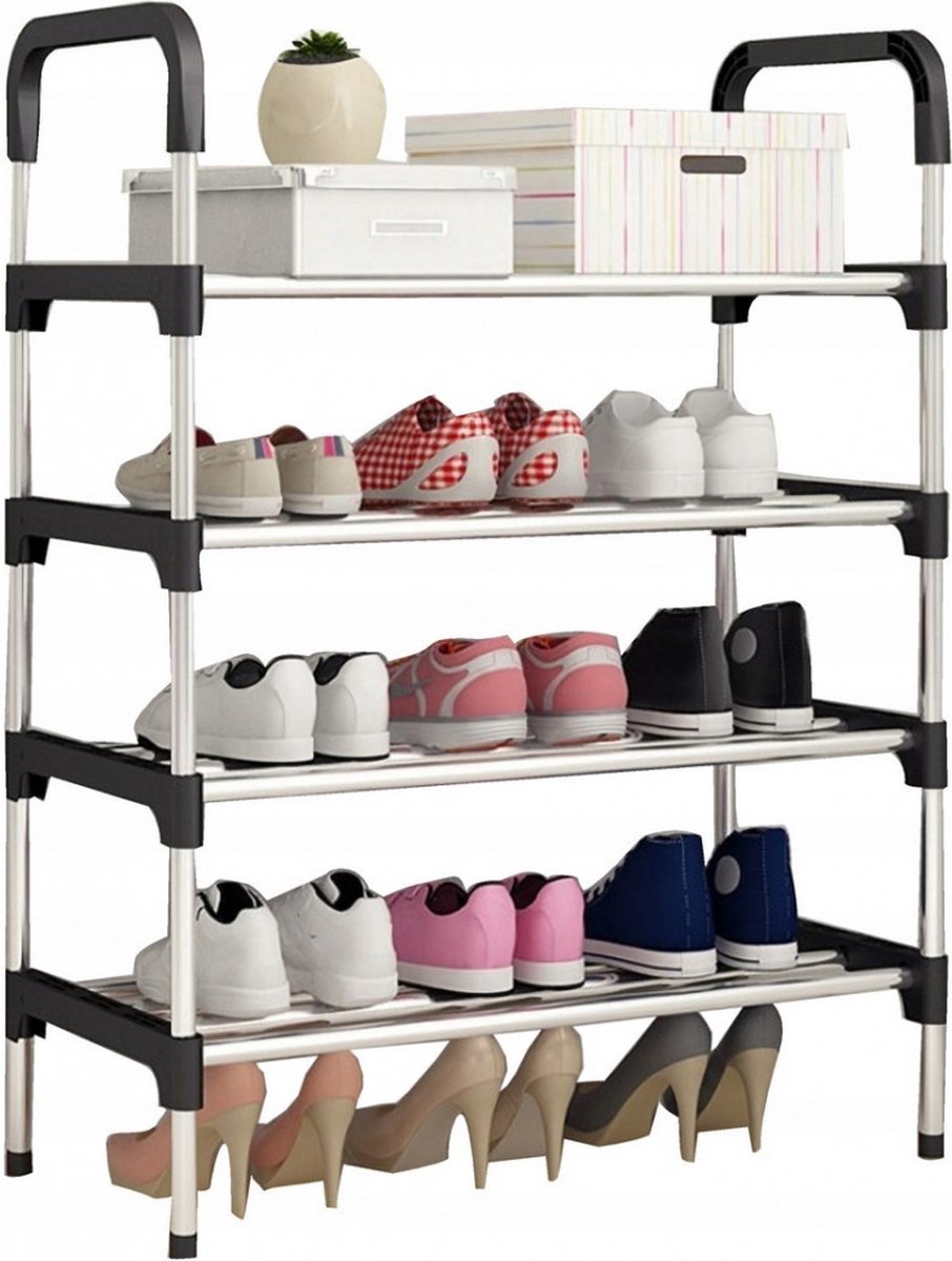 Eleganca Schoenenrek met 4 niveaus – B60 x H80 x D30 cm – Schoenenkast voor 16 paar schoenen – Universeel en stevig design – Zilver/Zwart