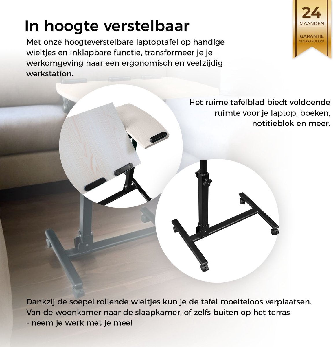 Met onze hoogteverstelbare laptoptafel op handige wieltjes en inklapbare functie, transformeer je je werkomgeving naar een ergonomisch en veelzijdig werkstation. Of je nu thuis werkt, studeert of gewoon ontspant, deze laptoptafel is de perfecte aanvulling op je dagelijkse routine.