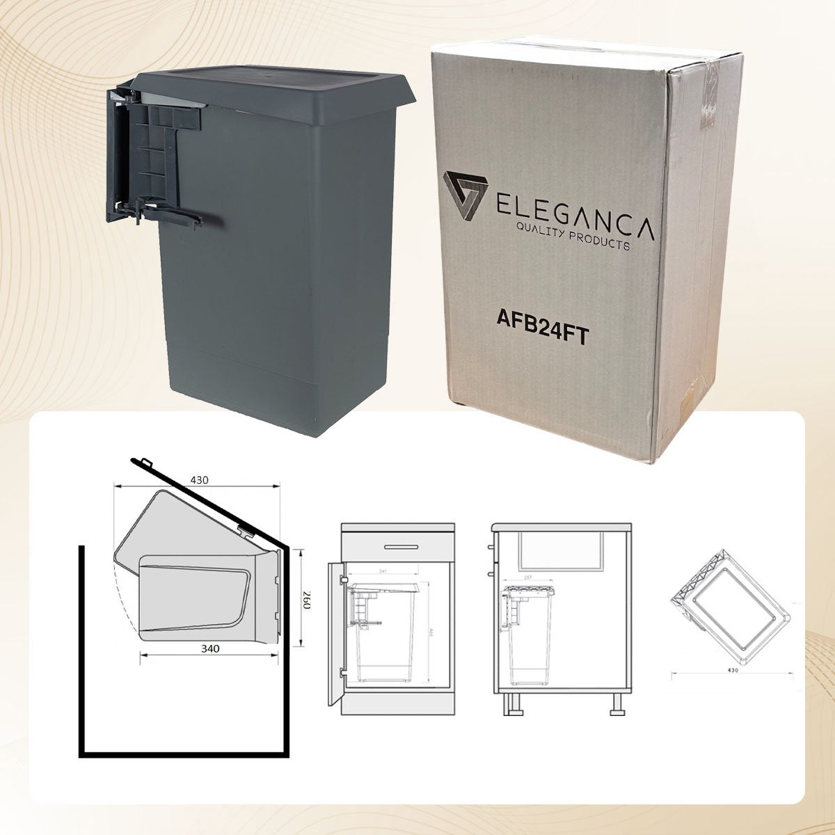 De Eleganca afvalbak 24L is eenvoudig met de bijgeleverde bevestigingsschroeven te monteren aan de wand van een (keuken)kast voor een maximale gebruikerservaring. De prullenbak heeft een formaat van B34 x D24 x H46 cm en past mooi in elke keuken.