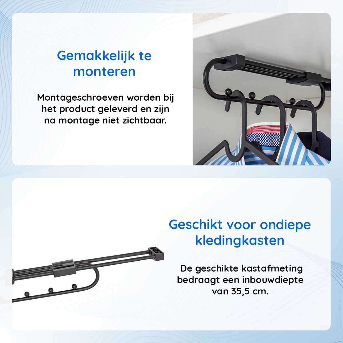 - Deze kledingstang is 33,5cm lang en nog eens 25,1cm uittrekbaar uit garderobe- of kledingkast. De geschikte kastafmeting om deze garderobestang in te bouwen bedraagt een inbouwdiepte van 35,5