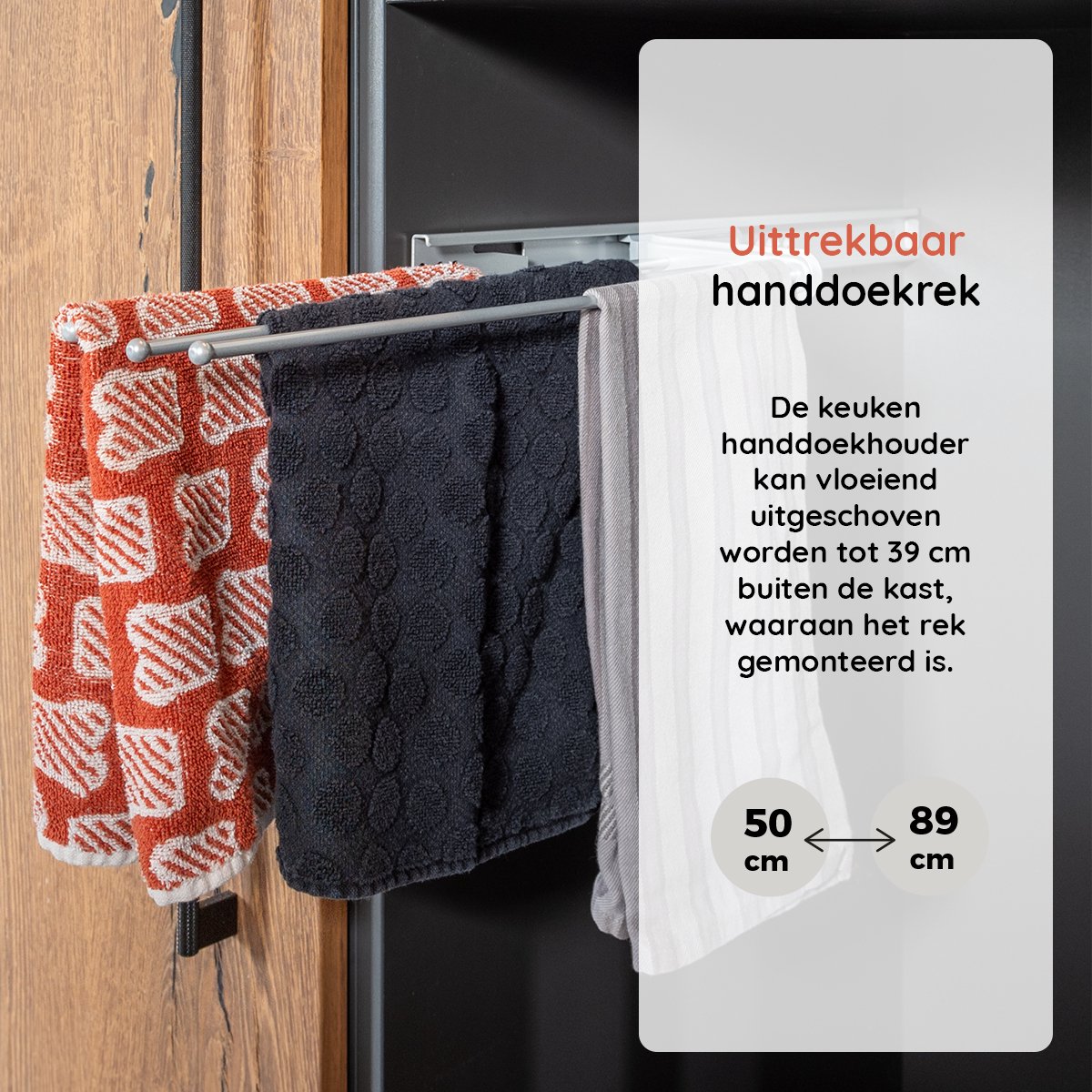 De Eleganca handdoekhouder is uittrekbaar tot 50 cm. Zo kan de keuken handdoekhouder vloeiend uitgeschoven worden buiten de kast. Dit moderne en stevige handdoekrek maakt uw keuken of badkamer compleet.
